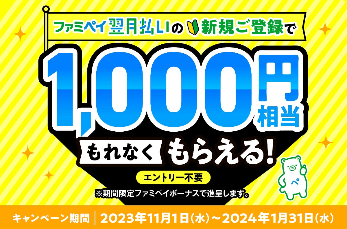 キャンペーン期間中に、ファミペイ翌月払いを新規にご登録いただくと、もれなく期間限定ファミペイボーナス 1,000円相当を進呈いたします。