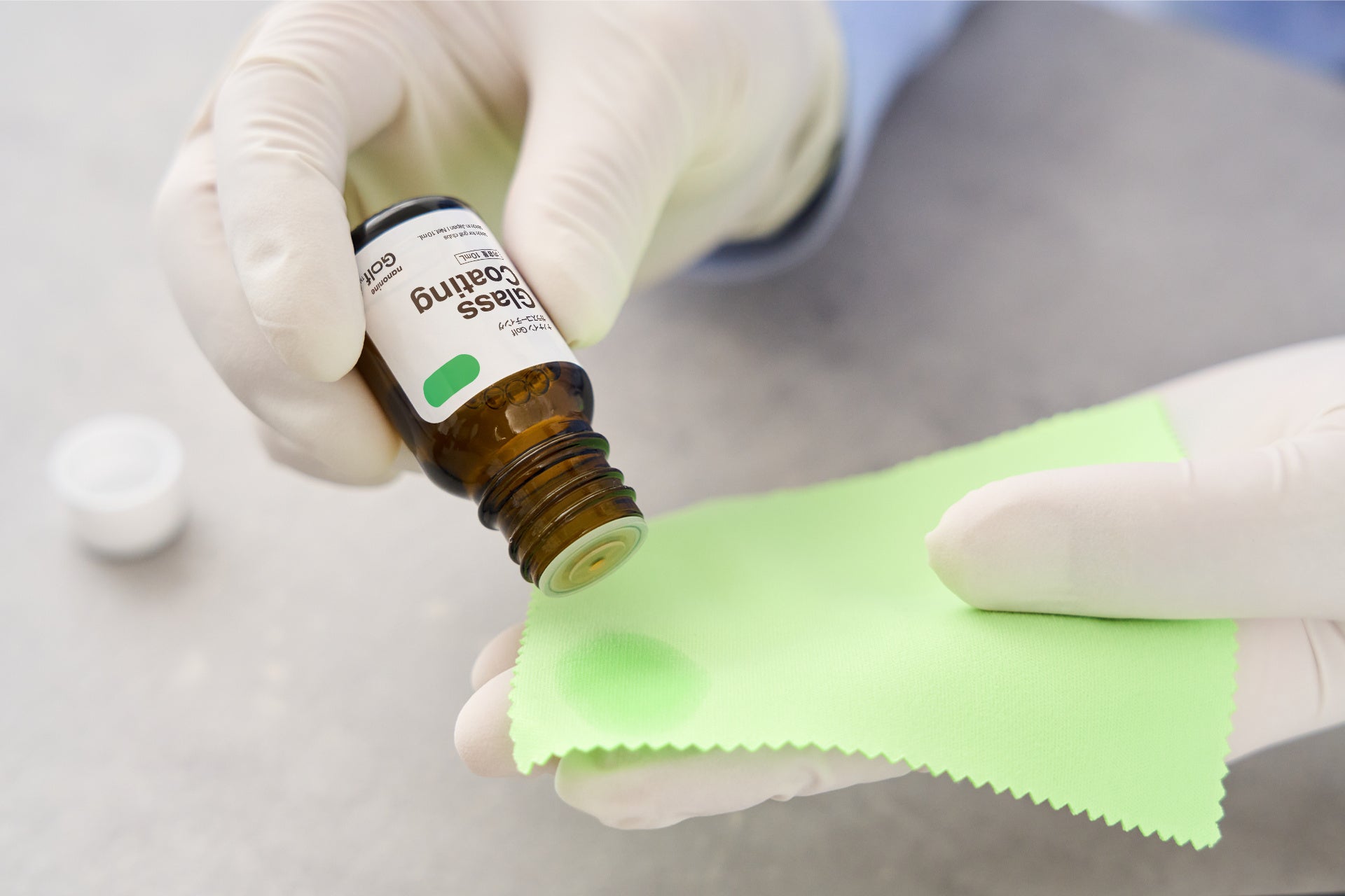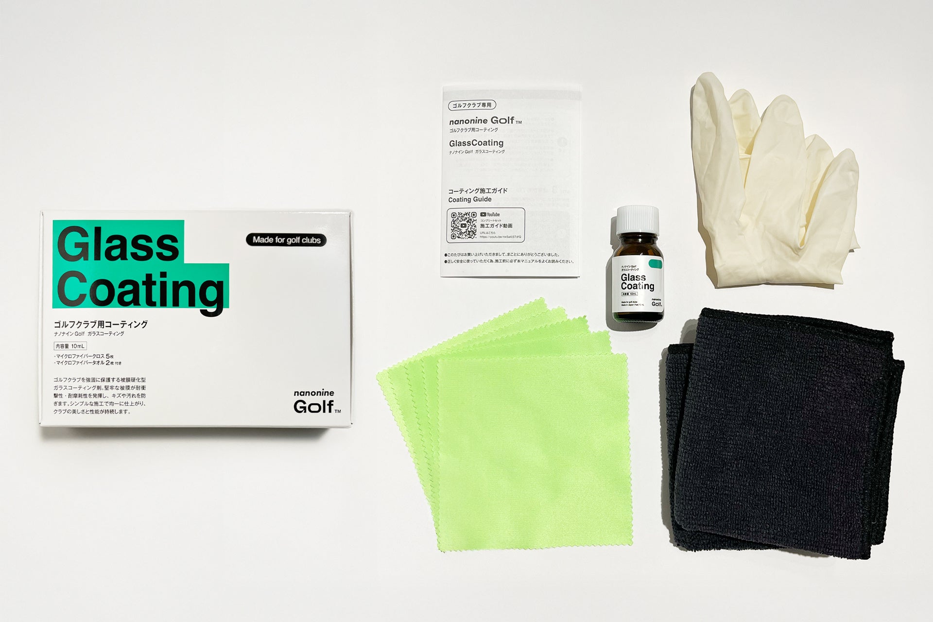 セット内容は、ガラスコーティング剤10mlに加え、塗布用クロス5枚、拭き取り用タオル2枚、保護手袋、施工ガイドを同梱。初めての方でも安心して取り組める構成となっています。