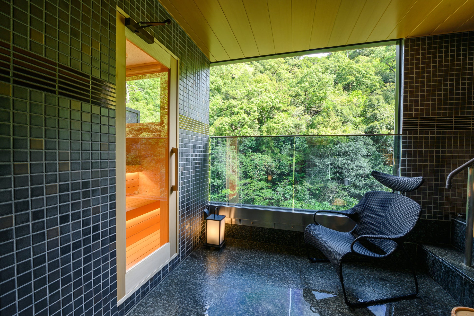 源泉露天風呂付きの洋室に"サウナ・水風呂"が加わる。プライベート空間で楽しむ本格ロウリュと、山中温泉の絶景を望む森林外気浴で、唯一無二の”ととのう”体験を。