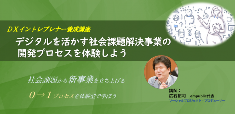 弊社では、豊富な社会起業家支援の経験を基に、DX=デジタル・トランスフォーメーションは「起こしたいX=人の行動や社会の仕組みの大きな変化(トランスフォーメーション)」を明確にし、その効果的な実現のためにデジタル(D)を使って価値創造することによって事業化が可能になると考え、事業開発支援や事業開発人材の育成に取り組んでいます。そのノウハウを活かして、「社会課題の事業化をどこから手を付けていいか、わからない」という方のために、「問題の理解→課題の深堀り→解決策を探る→事業アイデアにまとめる」という「0→1」のプロセスを、短期集中の事業プランづくり体験を通して体験的に学べる講座を開催します。新規事業開発やDXの基礎から実践までを短期集中で学べるプログラムとして企業研修でも大変好評を得ています。
