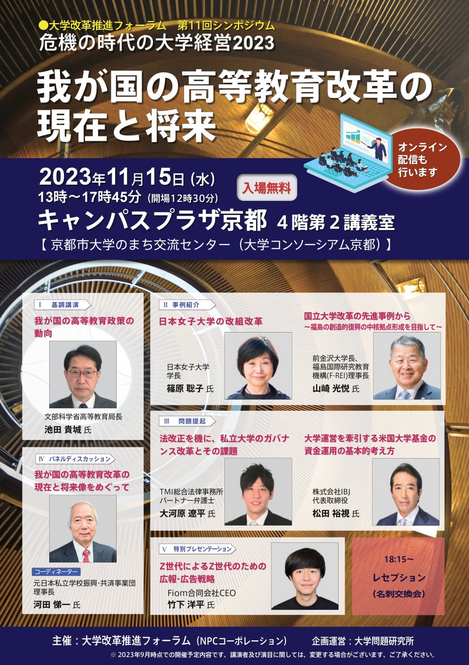 本シンポジウムを機に大学経営の諸課題を明らかにし、大学の「生き残り」戦略の推進の一助に資することができれば望外のことと考え、関西のみならず全国の高等教育関係者の方々に、リアル&オンラインでのご参集をお願い申し上げます。