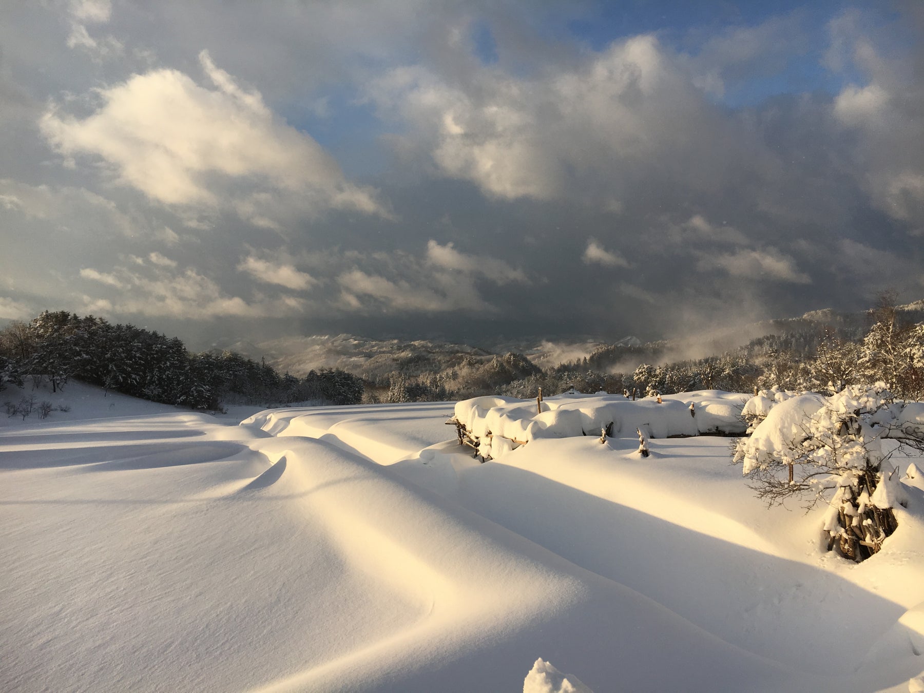 冬の楢山集落 晴れた日は眼下に見下ろす山々と雪原が美しい