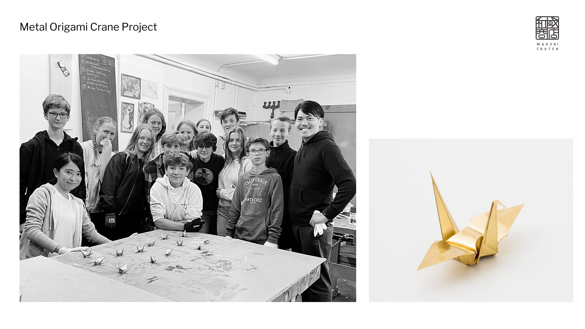 和國商店は屋根や外壁などの板金を手掛けるウチノ板金の工芸品ブランドで、板金の折鶴は海外のファンも多く、2022年からはフランス・ドイツの学校・大使館・公的機関で板金折鶴製作のワークショップも開催し、日本文化・折鶴の意味・板金技術を海外に伝える活動も行っています。