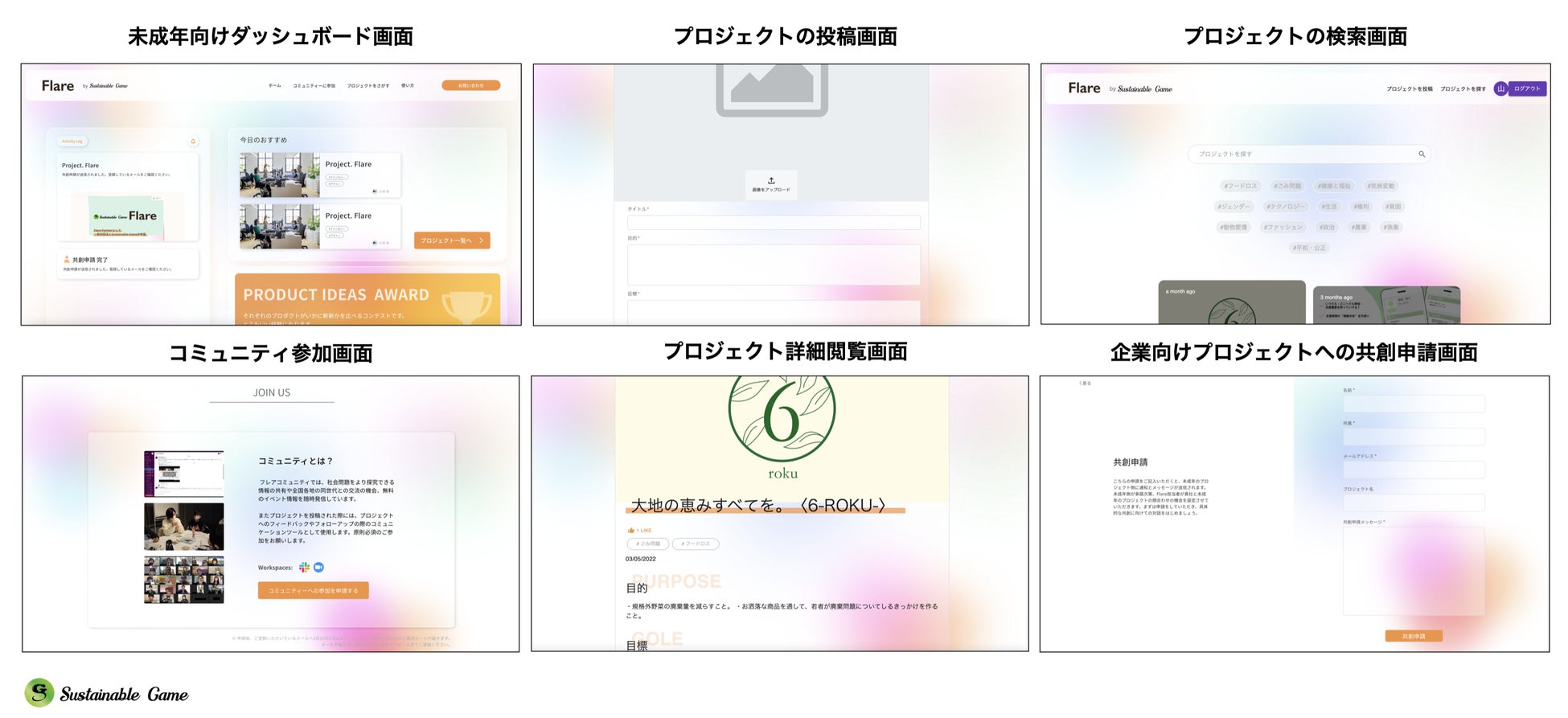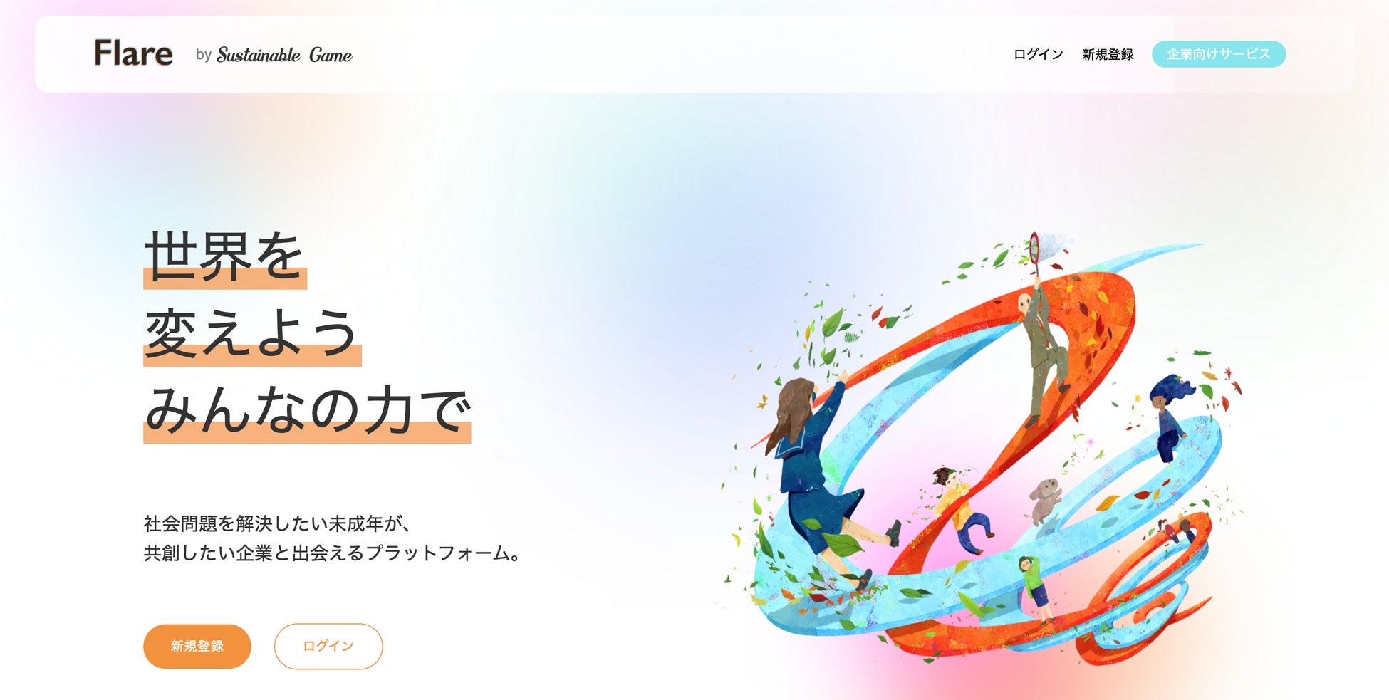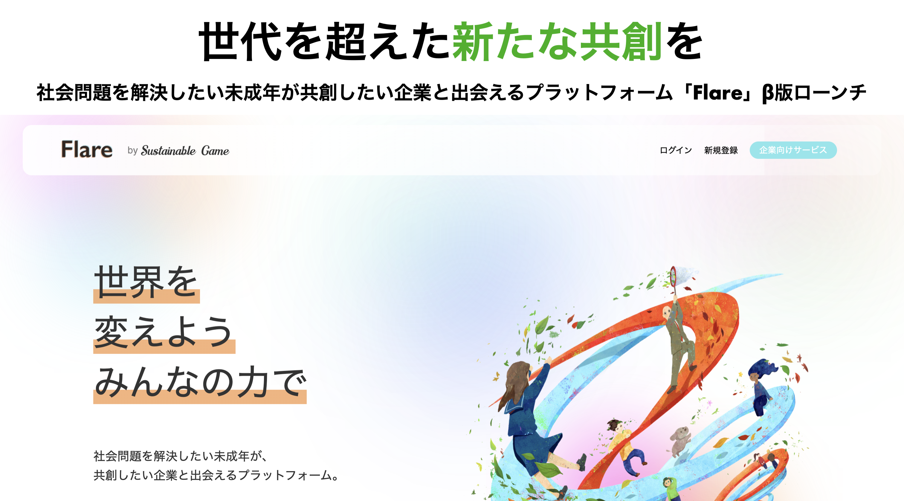 このような課題の解決に向けて、過去40社以上の企業との共創実績とノウハウを持ち、未成年による一般社団法人として活動するSustainable Gameの強みを活かした社会問題解決に向けた「未成年と企業の共創」を促進する新たなプラットフォーム「Flare」をリリースしました。