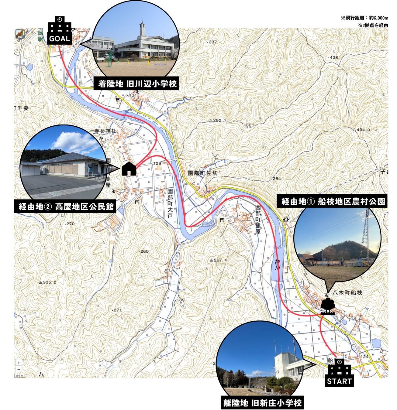 収容避難所である旧川辺小学校および旧新庄小学校を離発着地として設定し、上空からドローンを活用して中間の入り組んだ山間部に位置する複数経由地への物資供給を行う、全国でも類をみない実証となります。