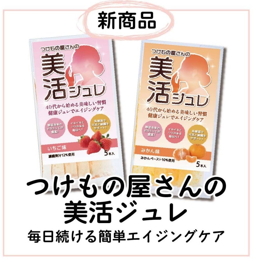 「美活ジュレ」は、漬物・発酵食品メーカー(老舗の漬物屋)としての当社の強みである、原料調達力・技術力・開発力・連携力を最大限に発揮し、構想から3年をかけて企画・開発された、「漬物屋が作った」新たなタイプの健康発酵食品であり、愛知に根差す老舗の漬物屋ならではの目利きにより選び抜かれた機能性素材を配合しています。約650年の歴史と使用実績を有し、安全・安心で栄養豊富な地元愛知の伝統素材「大豆麹」、ビタミン・食物繊維が豊富な国産白菜の外葉(未利用部位)に植物性乳酸菌を加えた「白菜発酵エキス」、ミネラル・食物繊維が豊富な国産大根の外皮(未利用部位)をそのまますりおろし加熱した「加熱大根おろし」に加えて、アンチエイジングに作用するとされるポリフェノールを多く含む「愛知県産いちじく」や、腸内環境や体内の脂肪燃焼に作用するとされる「アルロース(希少糖)」を配合しており、お客様の美容・健康に少しでも貢献できる素材を集めました。