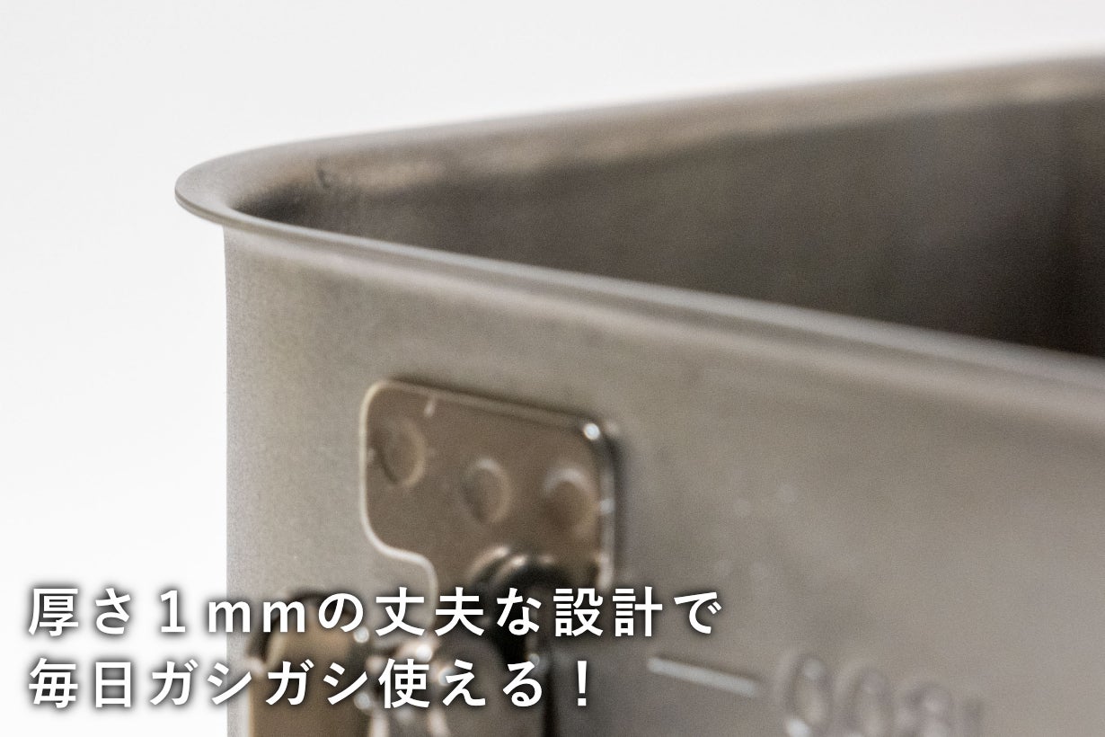 その後継モデルである角形の給食缶ミニ。実はお客様から「角形も欲しい!」とたくさんのお声を頂き開発に着手し、2023年10月にMakuakeでプロジェクトを実施したところ、1800万円を超える大ヒット商品となりました。