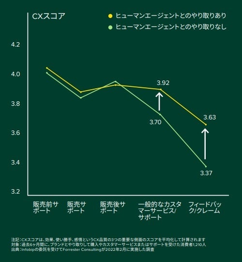 一般的に、問題が複雑であったり、感情的な問題がある場合は、人によるサポートの方が好まれる傾向にあります。例えば、一般的なサポートや意見・苦情対応の場合、人によるサポートの有無によるCXスコアを比較すると、人によるサポートがあった方がCXスコアが有意義に高いことが判明しました。