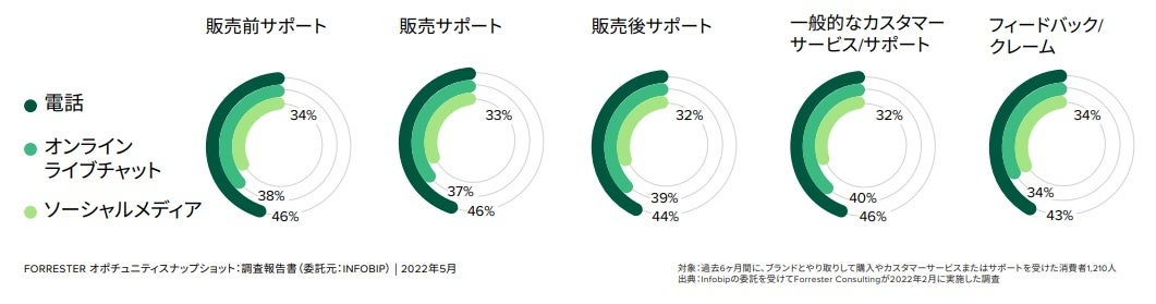 特に日本では電話を好む人が多く、64%が電話と回答しました。また、日本では電話の次に好まれる手段として「問い合わせフォーム」や「Eメール」が挙げられています。他のアジアの国では、電話に次ぐ手段としてソーシャルメディアやオンラインでのチャット(人とのチャット)が好まれている状況とは異なっています。