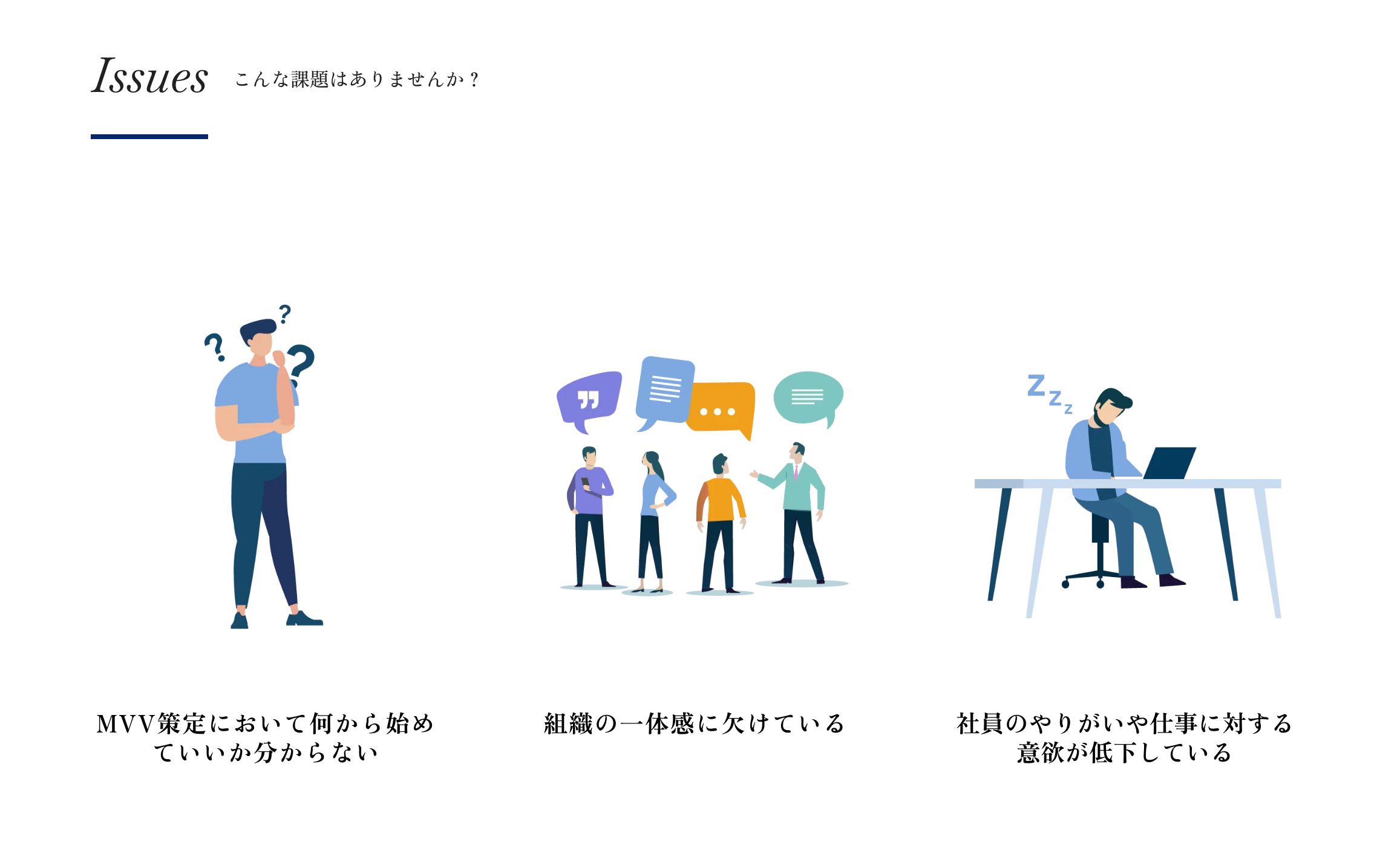 様々な悩みを抱える経営者の方々に寄り添い、MVVの策定から社内浸透まで一気通貫でお手伝いさせていただきます。