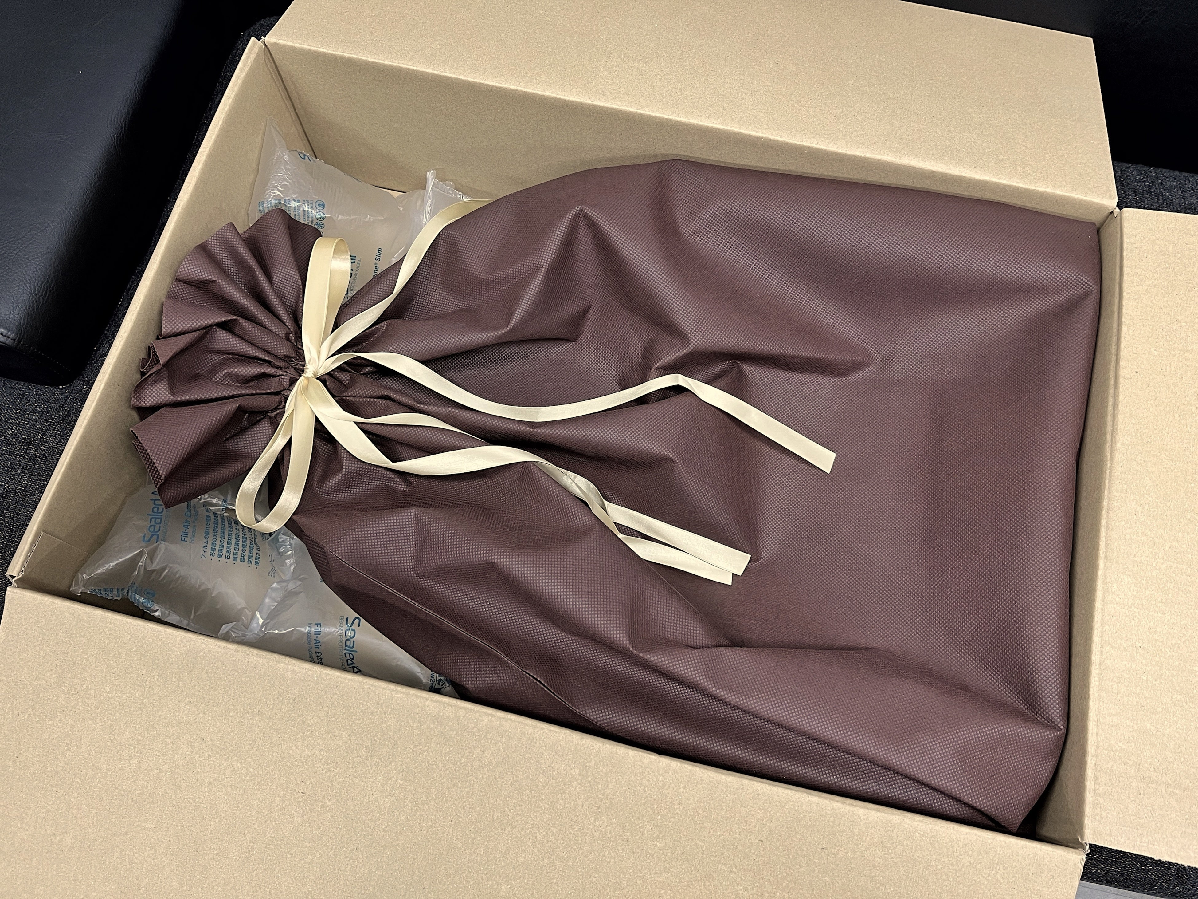公式サイトでオーダーしていただけますと、PREMIUMトートバッグの持ち手が曲がらないように縦長の大きな段ボールでお届けいたします。