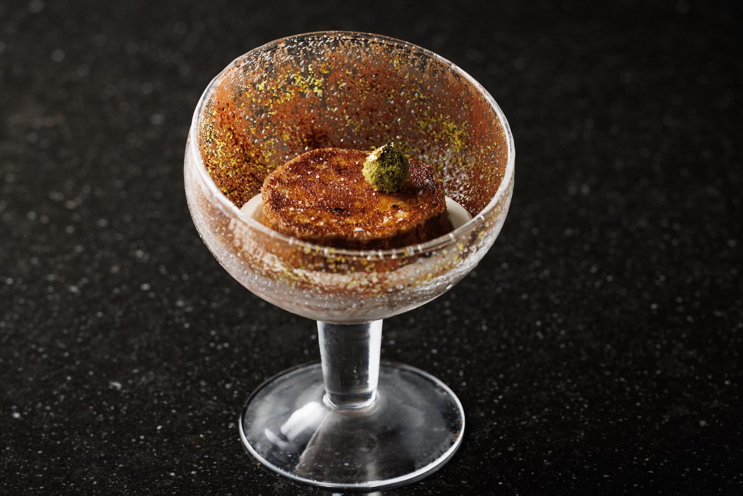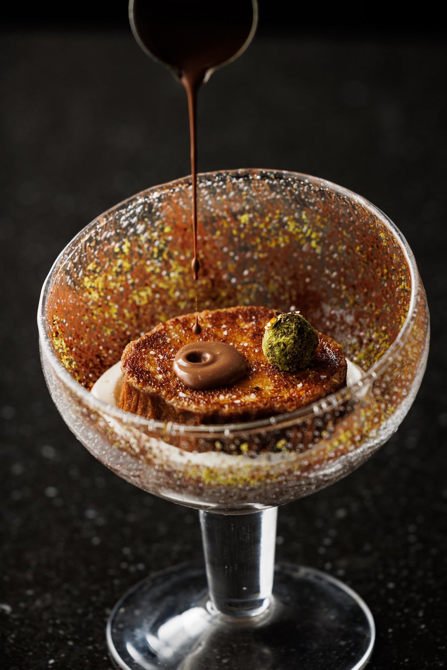 食べた瞬間、バターとキャラメル、そしてショコラの香りと共にピスタチオの風味がふわっと口の中に広がる「パン・ペルデュ・プラリネ・ピスターシュ」は、甘さを最小限に抑えることで素材の味を最大限に活かしました。しっとりとしたブリオッシュやザクザクしたプラリネの食感、温かいショコラソースと冷たいクリームのコントラストなど、味と食感のバランスを絶妙に組み立てたこだわりの一品です。スイーツの定番を独自の視点で再構築したフレンチトーストをご堪能ください。