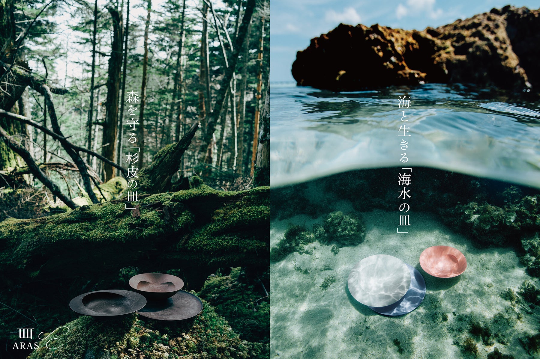 seccaと石川樹脂工業が共同開発する新樹脂素材を使った全く新しい器「ARAS」。杉の間伐の際に廃棄されてしまう「杉皮」や、海水を淡水化する過程で発生し、環境破壊につながる濃縮水から採取した「ミネラル」を使ったSustainable Collectionは、そのような人間の営みの過程で発生する行き場のない廃棄物を新素材と捉え、素材独自の質感を楽しみつつ、これまでにない新たな食体験を提案するコレクションです。