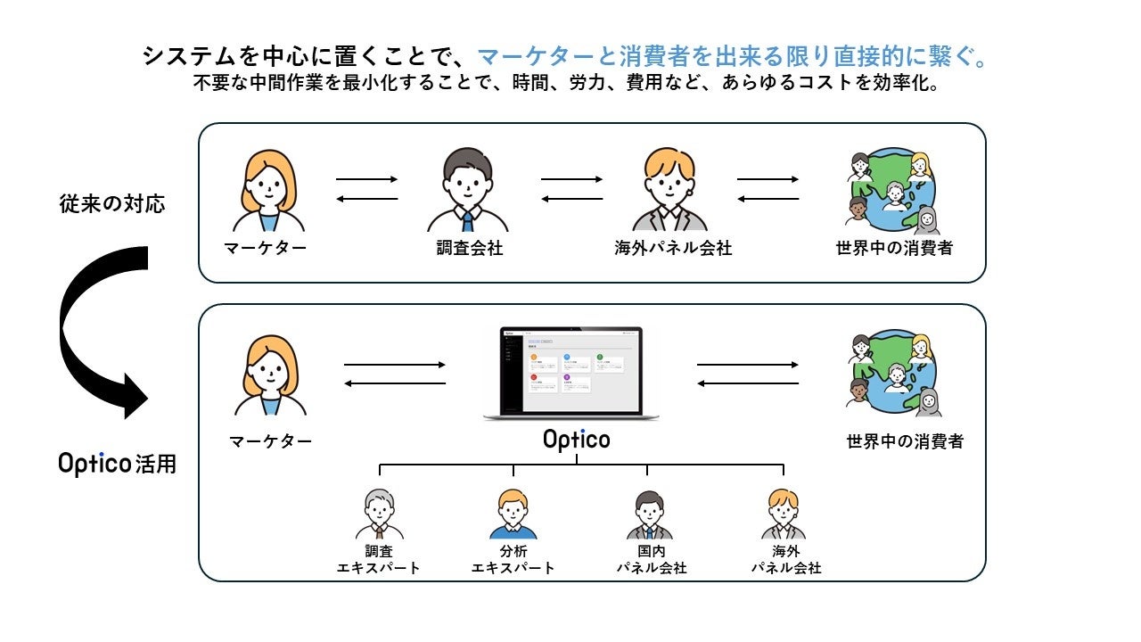 この連携により、マーケターはlooking upシステム開発を手掛ける"マーケティングリサーチの新発想DXプラットフォーム"「OPTICO」を利用して、Cintの130カ国、3.35億人以上のアンケートモニターからなる、世界最大のパネルネットワークにダイレクトにアクセスすることが可能になります。