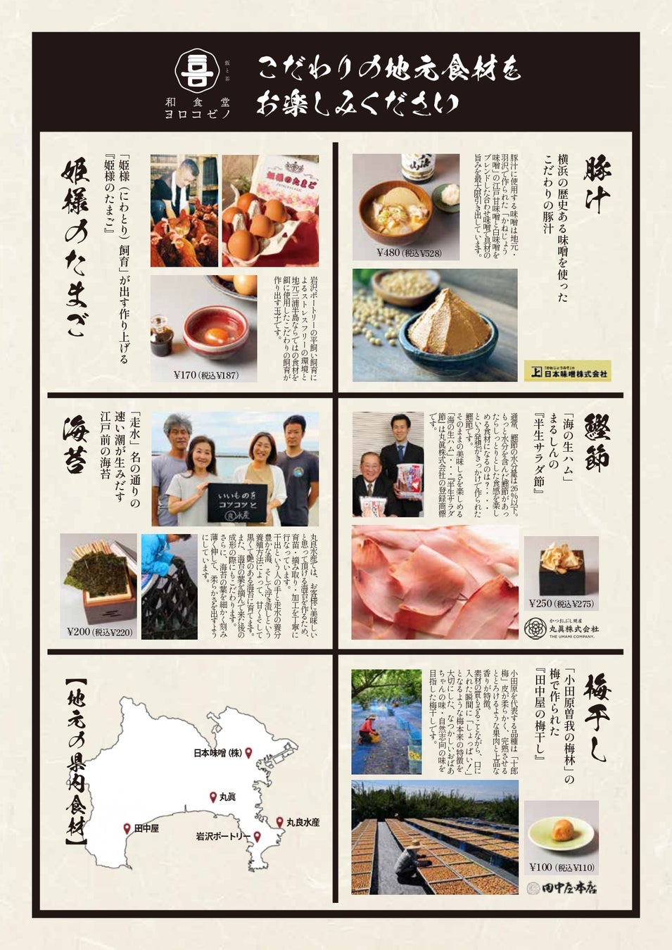 神奈川県の食材を積極的に取り入れ、横浜で作られる味噌、三浦野菜と三崎マグロ等を餌に育った鶏の卵、地元羽沢の野菜、神奈川ブランド100選にも選ばれた横須賀 走水の海苔、創業100年小田原 田中屋本店の梅干しと佃煮など生産者さんへ直接出向き、生産へのストーリーをお伺いしたのちに取り扱いを決めております。