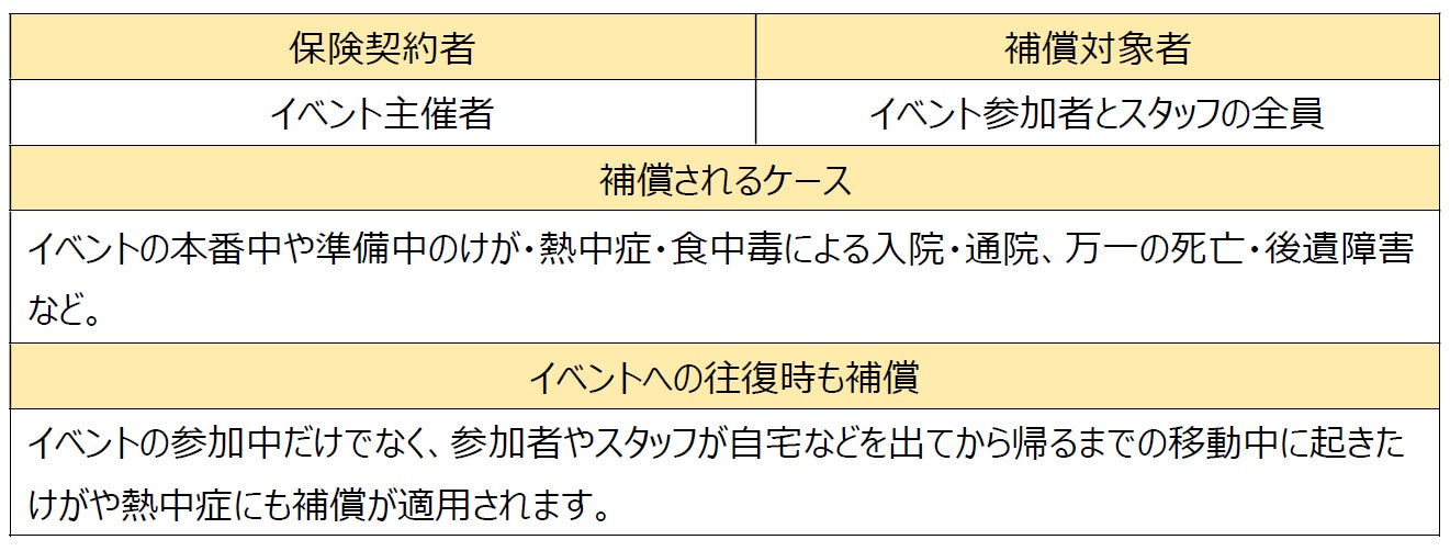 保険をかけた日(保険期間)の出来事であれば、イベント本番が始まる前の準備中にスタッフがけがをした場合などにも保険が適用されます。