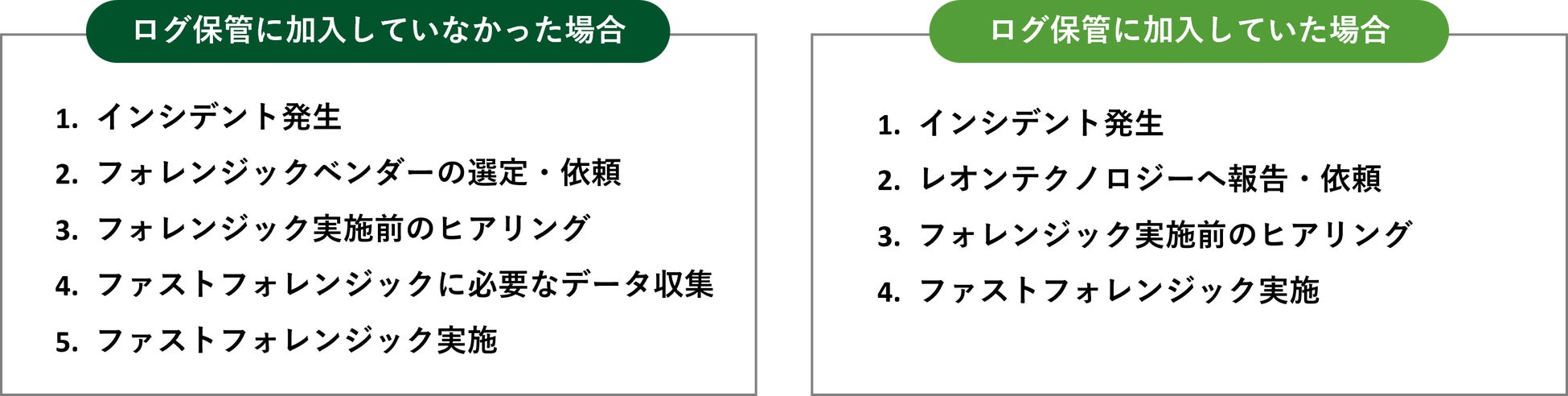 インシデント発生時のログが正しくアップロードできている場合、弊社で保管されているログを用いて調査可能です。また、ベンダー選定や、調査に必要なデータ収集作業など、ファストフォレンジック実施までに要する期間短縮や、「ログが上書きによって削除された」というリスクを軽減できます。