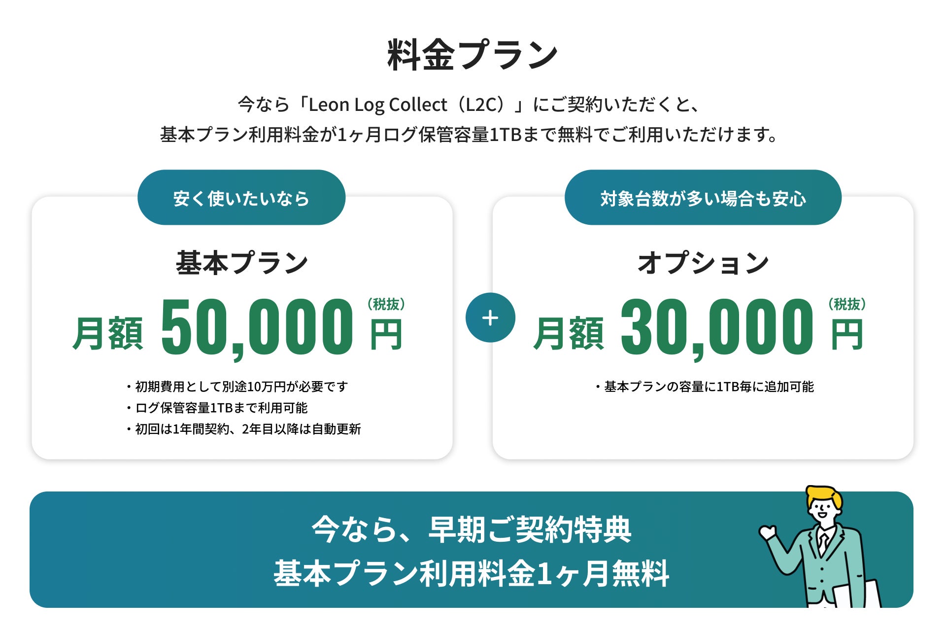 今なら「Leon Log Collect(L2C)」にご契約いただくと、基本プラン利用料金が1ヶ月ログ保管容量1TB(パソコン約50台分)まで無料でご利用いただけます。対象台数に応じてオプションプランもご用意しています。