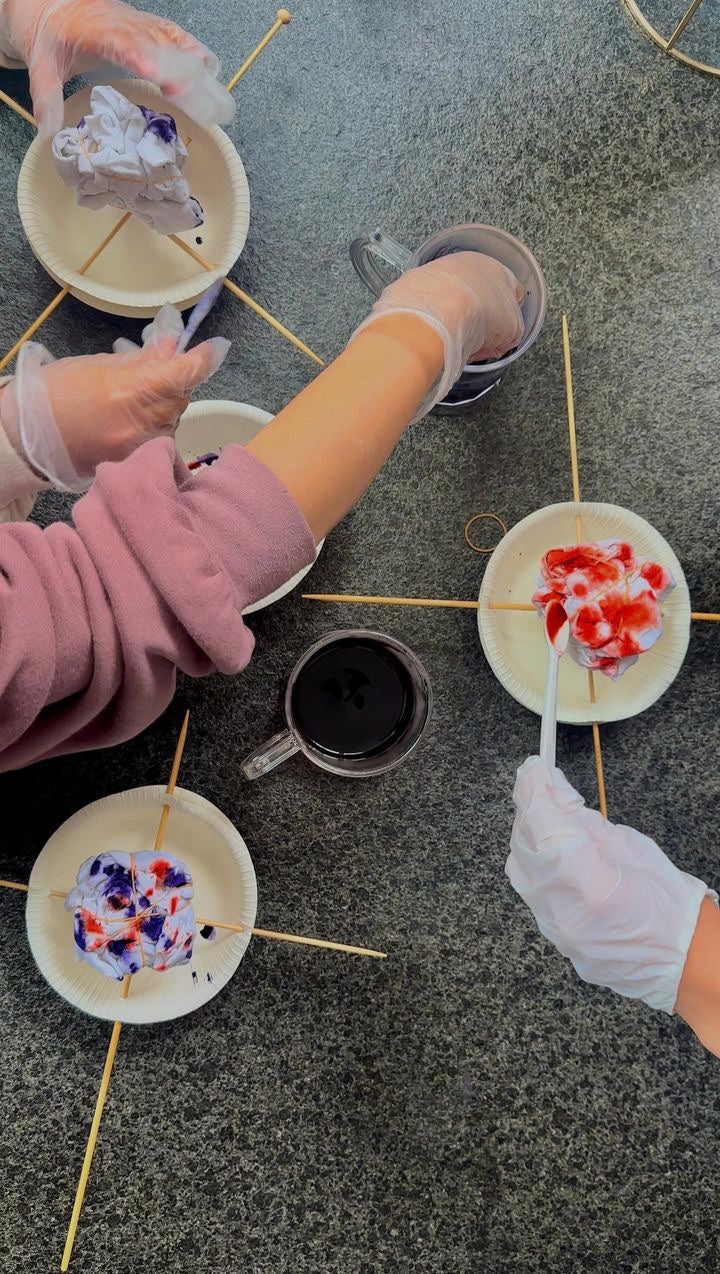 染料を素材の上からスプーン・ボトルなどを使って垂らして染めます