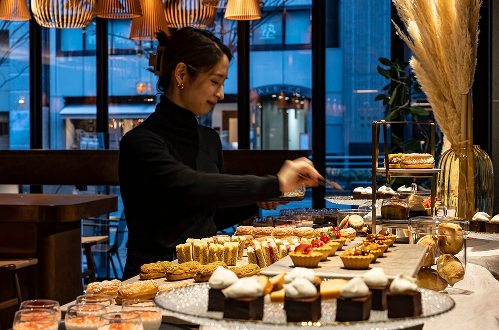 そのほか、良質なほうじ茶パウダーをたっぷりと使用し、アクセントに塩気のあるチョコクッキーを散りばめたとろける口どけの「ほうじ茶のムース」や、4種類のナッツをローストし、濃厚でほろ苦いキャラメルを絡めた「ナッツキャラメルタルト」など、合わせて18種類以上のデセールとセイボリーをご用意しました。京都・小川珈琲特製のsequenceブレンドコーヒーや15種類のフレーバーを揃えた紅茶と共に、心ゆくまでお楽しみください。
