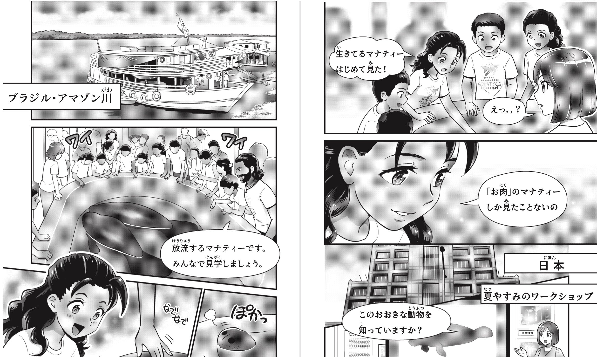 アマゾンの絶滅危惧種マナティーの保全について、皆さんに知っていただきたいことをまんが形式で語りかけています。