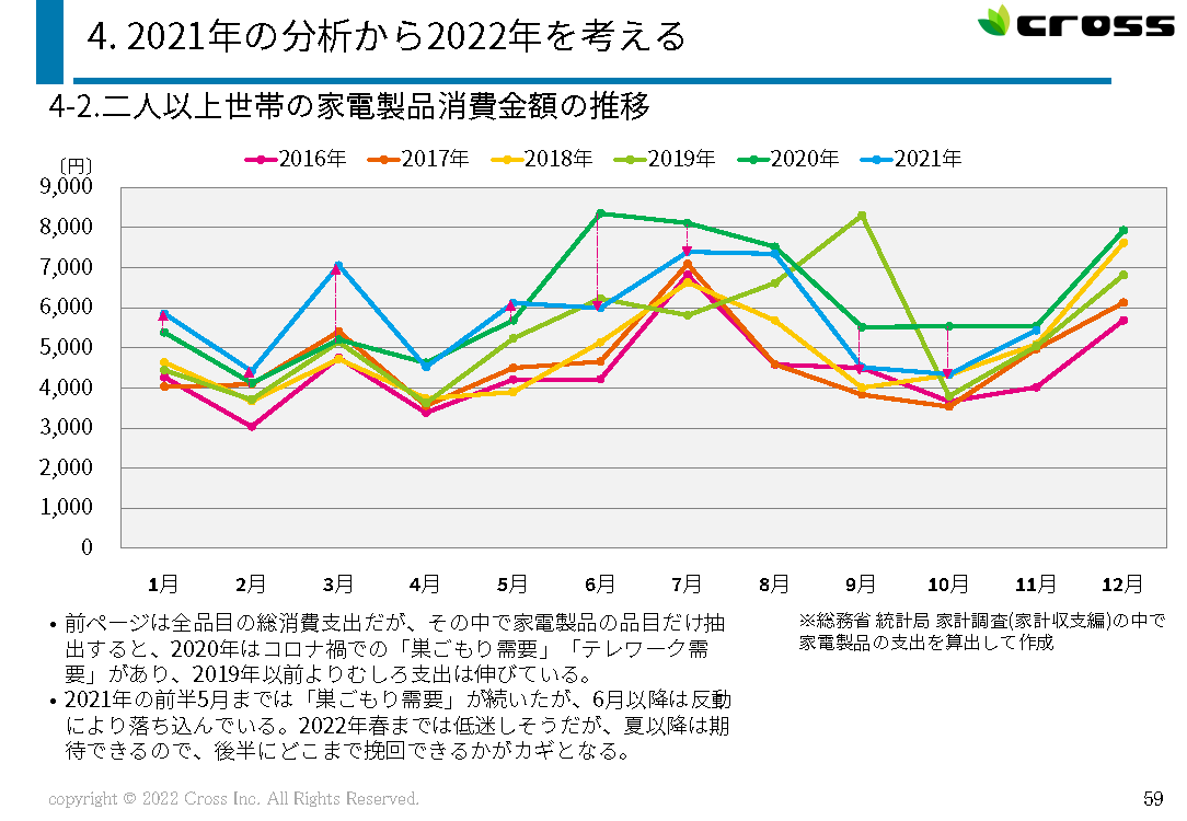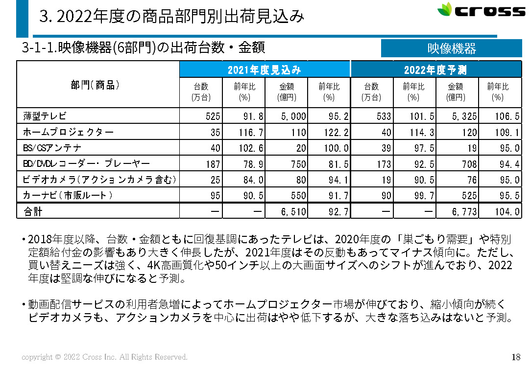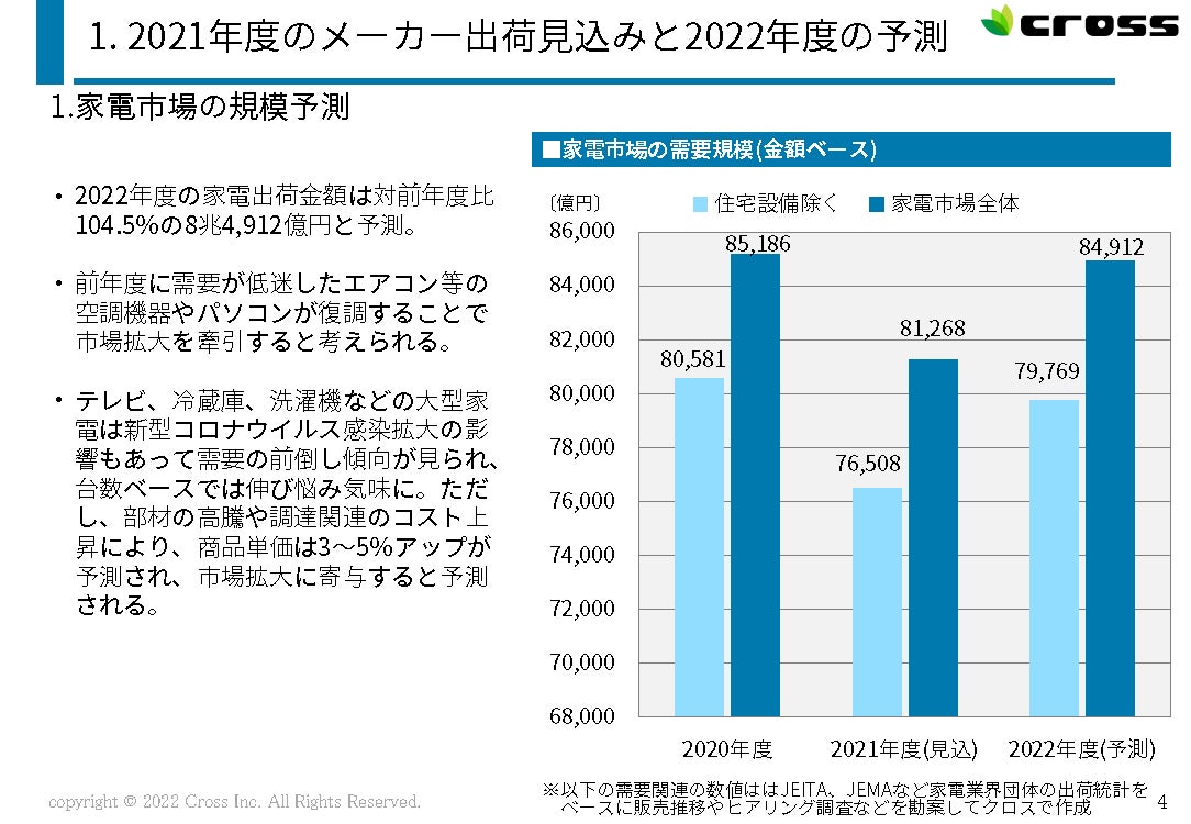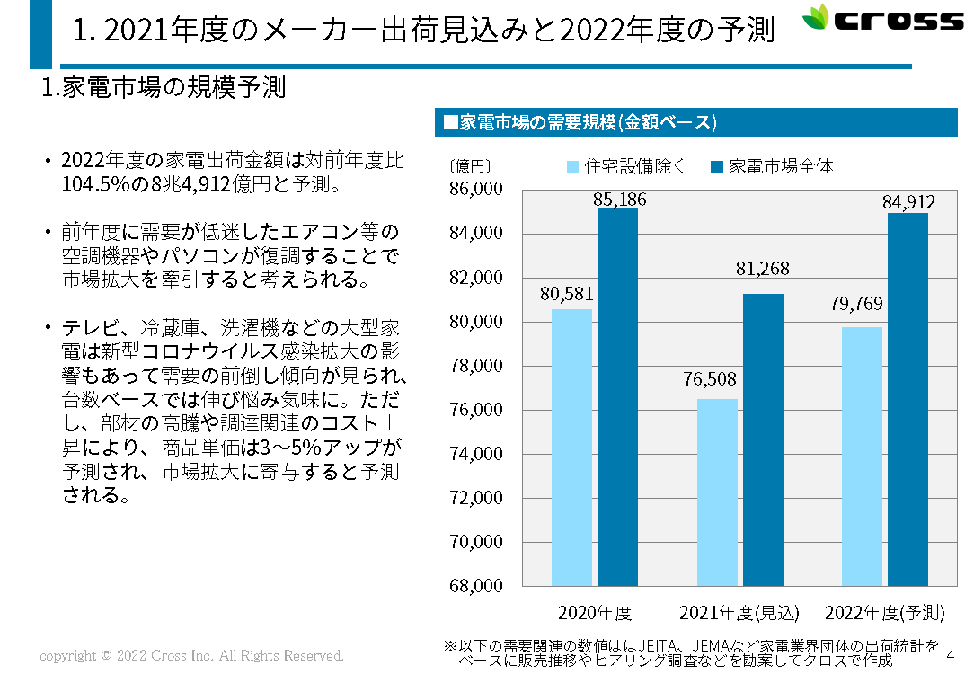 2022年度の需要予測にあたっては各業界団体が公表している出荷統計をベースにしながらも、弊社が長年蓄積したデータと照合し、さらに販売現場の声や家電メーカー様から全体需要の見込みや予測のヒアリングを実施し、よりデータの精度を高めたものです。