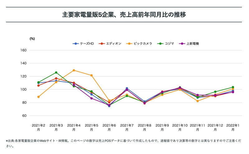 2020年度は新型コロナウイルス感染拡大の影響を受けて外出自粛ムードとなり、いわゆる「巣ごもり需要」「テレワーク需要」などと家電商品買い替えが重なり、大きく需要が伸びました。2021年度も引き続きコロナ禍にありながらも「巣ごもり需要」などが落ち着いたことで需要(金額ベース)は前年度比95.4%と低迷しました。