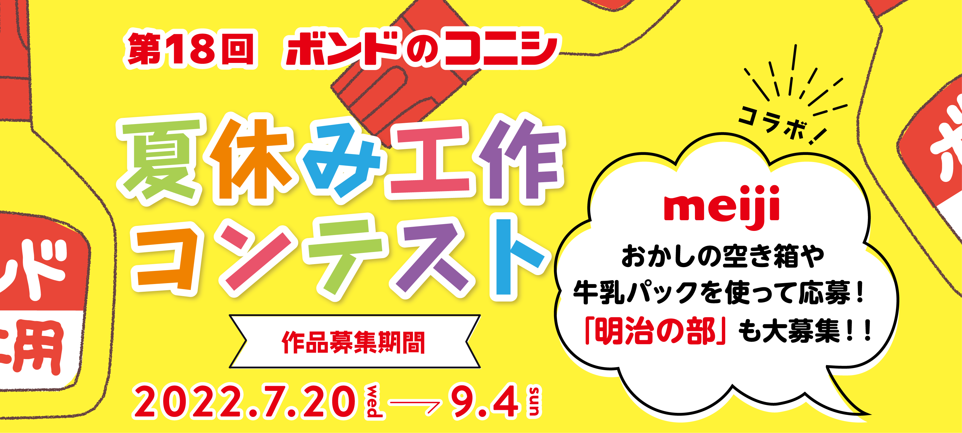第18回となる今年は、スペシャル企画として食品メーカー『株式会社 明治』とのコラボ部門となる「明治の部」を設け、明治製品の空き箱や空き容器とコニシの「ボンド」を使った工作も大募集します。お子様が大好きなチョコレートなどのお菓子やアイスの箱、牛乳パックやヨーグルトの容器などで、自由自在に工作を楽しんでください!
