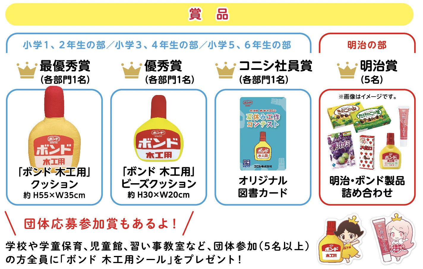 また、最優秀賞(各部門1名)にはBIGで可愛い「ボンド 木工用 クッション」を進呈するなど、各受賞者には豪華賞品をご用意しています。さらに、5名以上の団体参加の方には、もれなく参加賞を差し上げます。