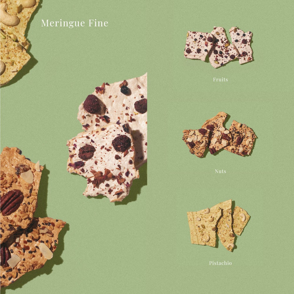 メレンゲを薄く広げて、ナッツやフルーツ、エディブルフラワーなどをふんだんに敷き詰めた見た目も楽しいメレンゲバー。板チョコのような気軽さも魅力で、贅沢な食感の変化とフレーバー、その軽い食べ口は年齢問わず楽しんでいただけます。
