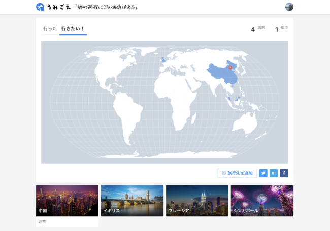ログインすると「行ったことのある国」「行きたい国」をうみごえに記録することが出来ます。ブラウザでいう、お気に入り機能の国バージョンと捉えていただけたら幸いです。トップページ横にあるアイコンをクリックしていただければ、世界地図が表示され、記録した国を見返すことが可能となっています。