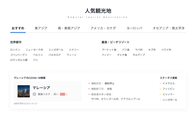 ベストシーズンカレンダーには、1月から12月までのおすすめの国を表示。「行きたい国があるけどいつ行くのがベストなのだろうか」、「8月は連休が取れた、どこの国に行こうかな」など、その疑問にお答えできる仕様にしてあります。