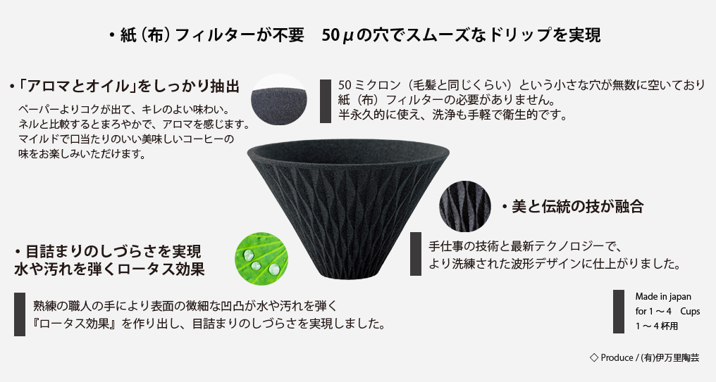 「コフィル」は、釉薬が溶ける温度を熟練の職人の手によりコントロールすることで、微粒子の表面に微細な凹凸を生じさせ「ロータス効果」を作り出し、目づまりのしづらさを実現しました。