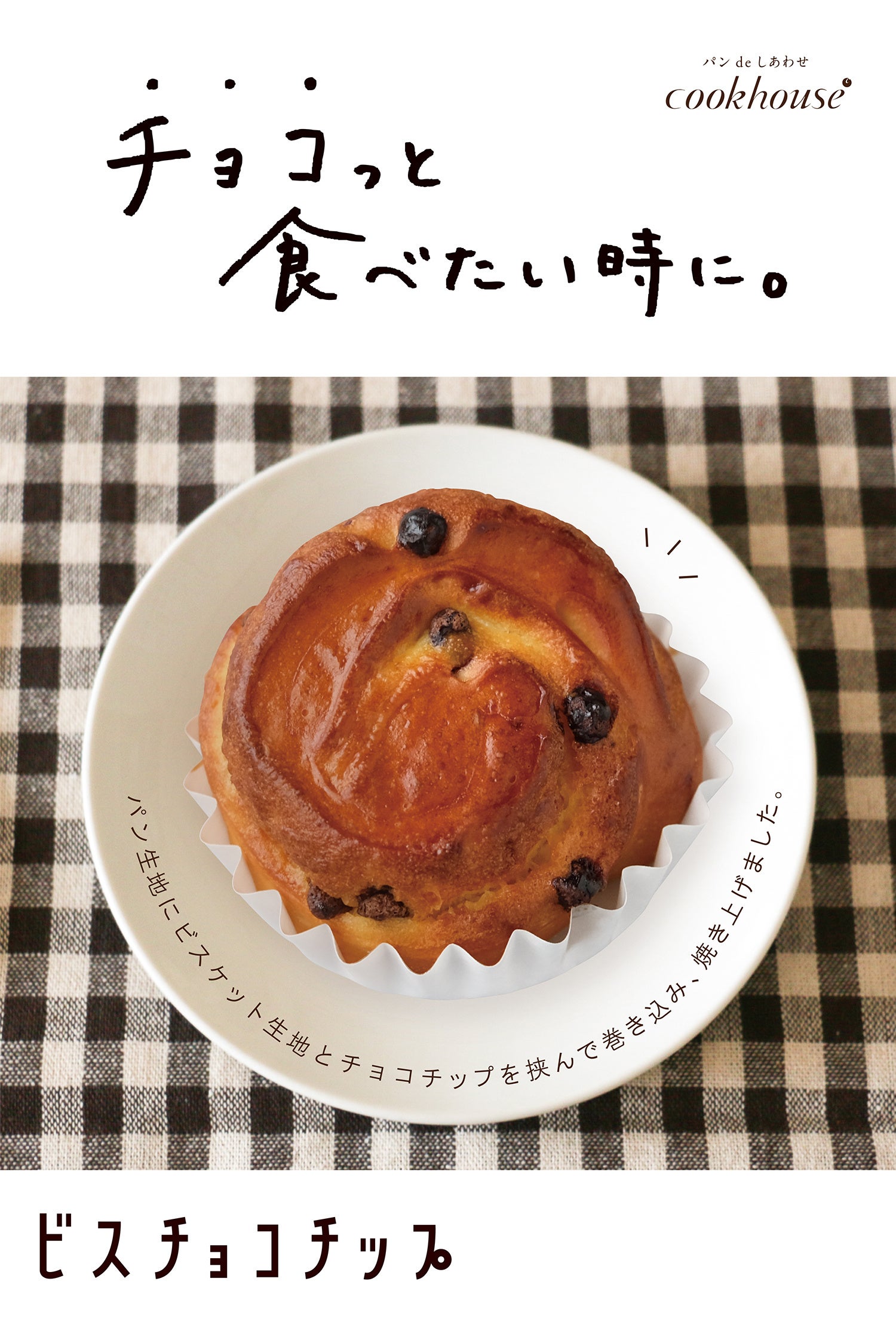 パン生地にビスケット生地とチョコチップを挟んで巻き込み、焼き上げました。