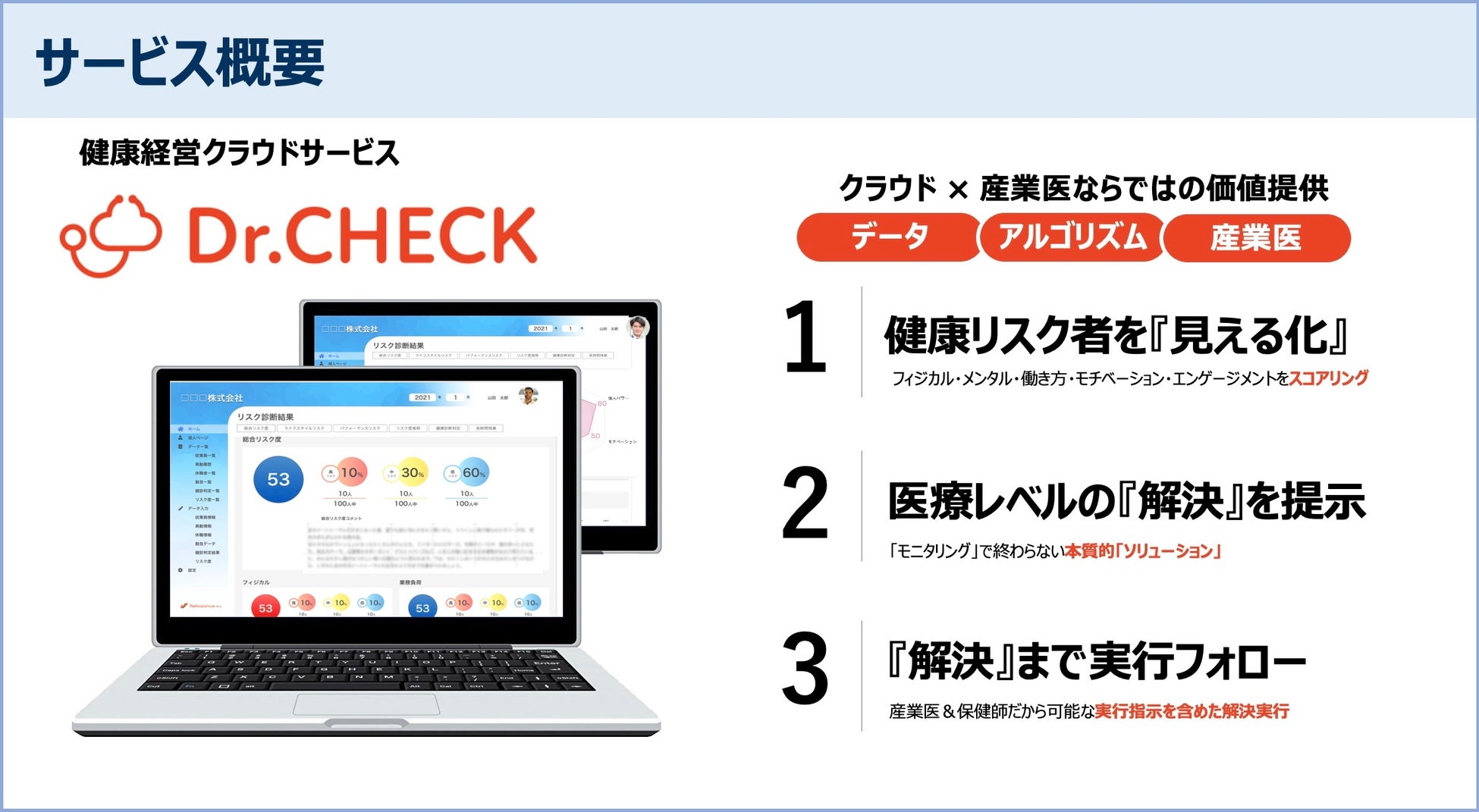 「Dr.CHECK」は、プロ産業医として約1万人の従業員の健康を管理する医師監修のクラウド型健康管理システムです。勤怠データ・健診結果から従業員の健康状態を診断、独自のアルゴリズムとプロ産業医のダブルチェックで、企業・従業員の健康リスクを『見える化』します。さらに、そのリスクに対してリバランス保健師・産業医が解決までフォローすることで、実感できる健康経営を実現します。
