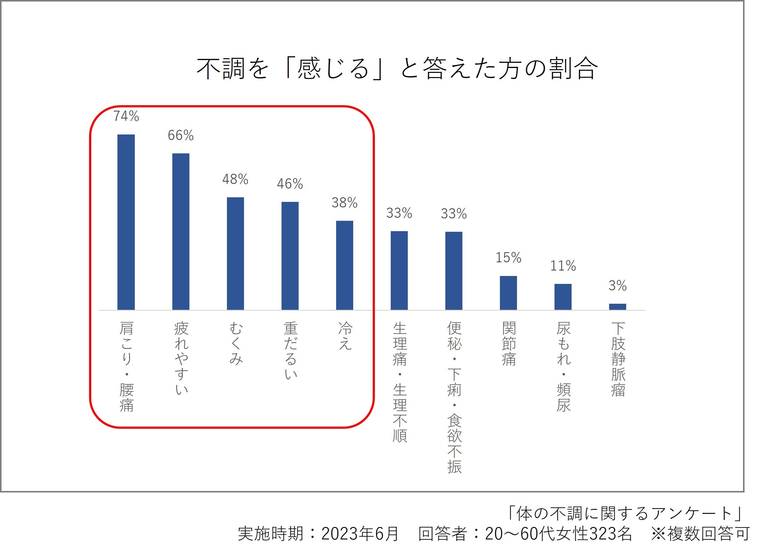 MAEÈでは、肩こり・腰痛、疲れやすさ、むくみ、冷えなどに悩む女性が多いことに着目。これらの不調は、体内のめぐりの悪さが引き起こす症状という共通点があります。