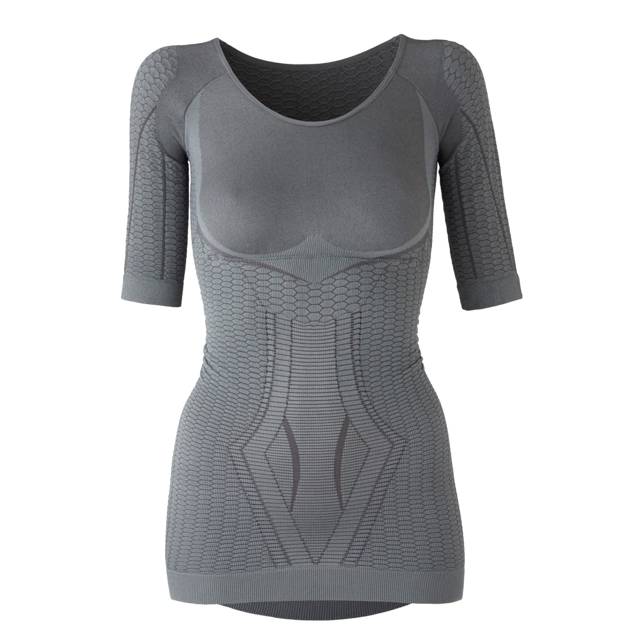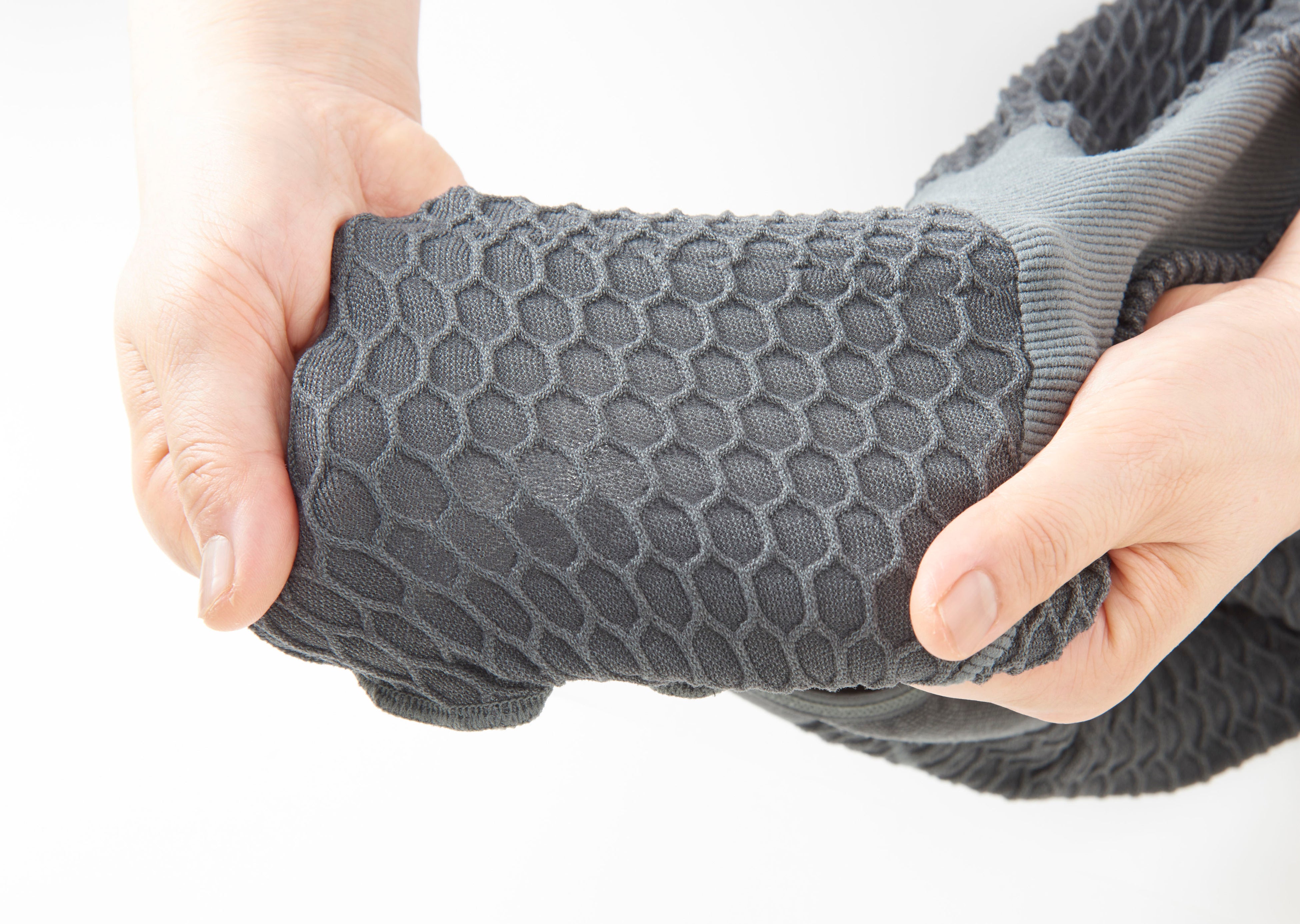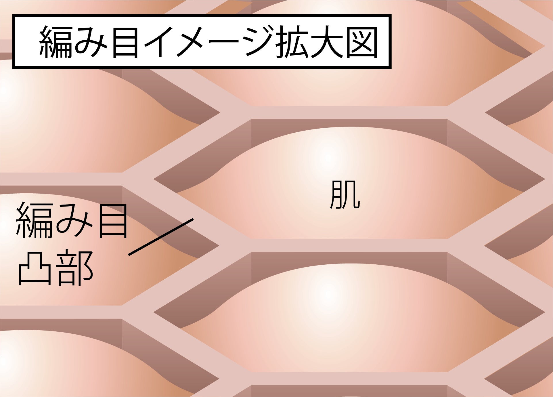 肌にあたる面を、六角形が連続したハニカム状の編地に。伸ばしてもつぶれにくい特殊な凹凸構造は、からだの動きに従って縦横無尽に伸縮。仕事や家事など、普段通り日常生活を送るだけで、着ている間中やさしく肌を刺激します。