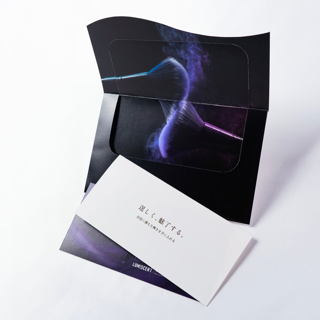 ルミセントの化粧水をお買い上げいただいたお客様に、新商品の美容液サンプルをお届けするため、特別なデザインのDMを作成しました。封筒の開封口にはミシン目を施し、開ける際にビリビリとした音が鳴る仕様です。これにより、開封時の楽しさと驚きを演出します。封筒のデザインは白と黒を基調としたシンプルでエレガントなものとなっており、開封すると、内側は全面黒色と鮮やかな紫色がコントラストを成し、視覚的なインパクトを与えます。用紙にはペルーラのスノーホワイトを使用しています。この用紙は両面がパール調で上品に輝き、高級感があります。化粧品のパッケージにもよく使用されているため、今回のDMに最適と判断しました。