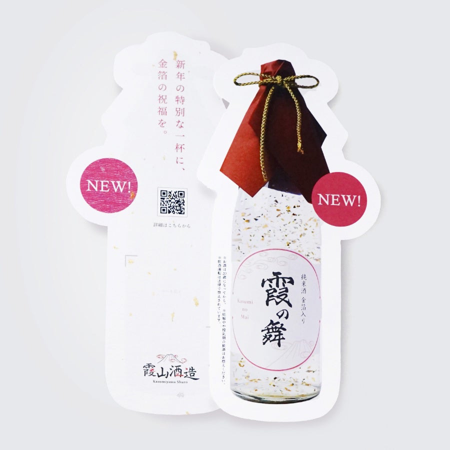 金箔入り日本酒「霞の舞」は、新年のお祝いにふさわしい商品であり、伝統的な日本の美しさを表現と、ボトル写真が美しく印刷されるよう、和紙を貼合(合紙・貼り)加工した用紙を採用しました。新年の祝いの席で金箔入り日本酒を楽しんでいただきたいという想いから、祝いにふさわしい高級和紙「ことぶき(寿)」を選びました。柔らかな質感と自然な色合いを持つ「ことぶき」は、日本酒の深みと職人の技を優雅に伝え、紙面に施された金箔が日本酒に浮かぶ金箔と美しく調和しています。