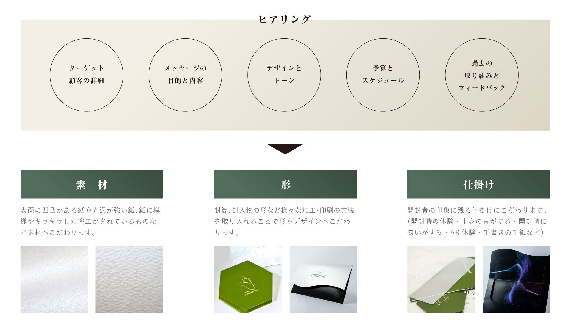 企画力と洗礼されたデザインを融合させ、依頼主のご要望に合わせた独自のアイデアを提供します。ヒアリングをもとに私たちはDM全体の形や素材のデザインを落とし込んでいきます。