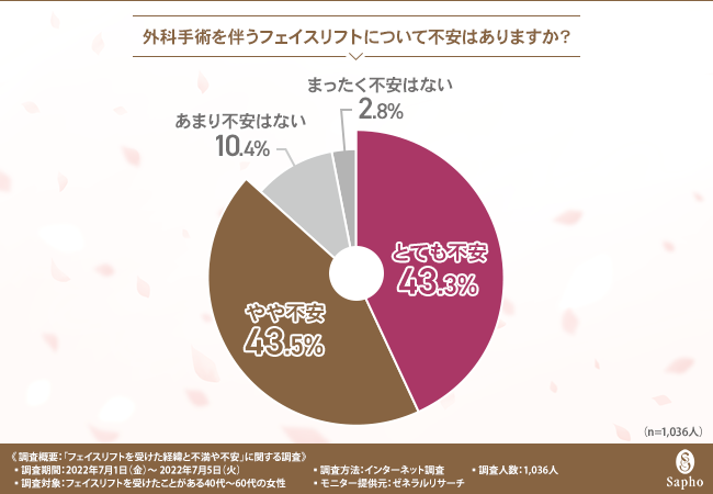今回の調査の結果では、大多数の方が外科手術を伴うフェイスリフトには、まだまだ不安がある事が分かりました。