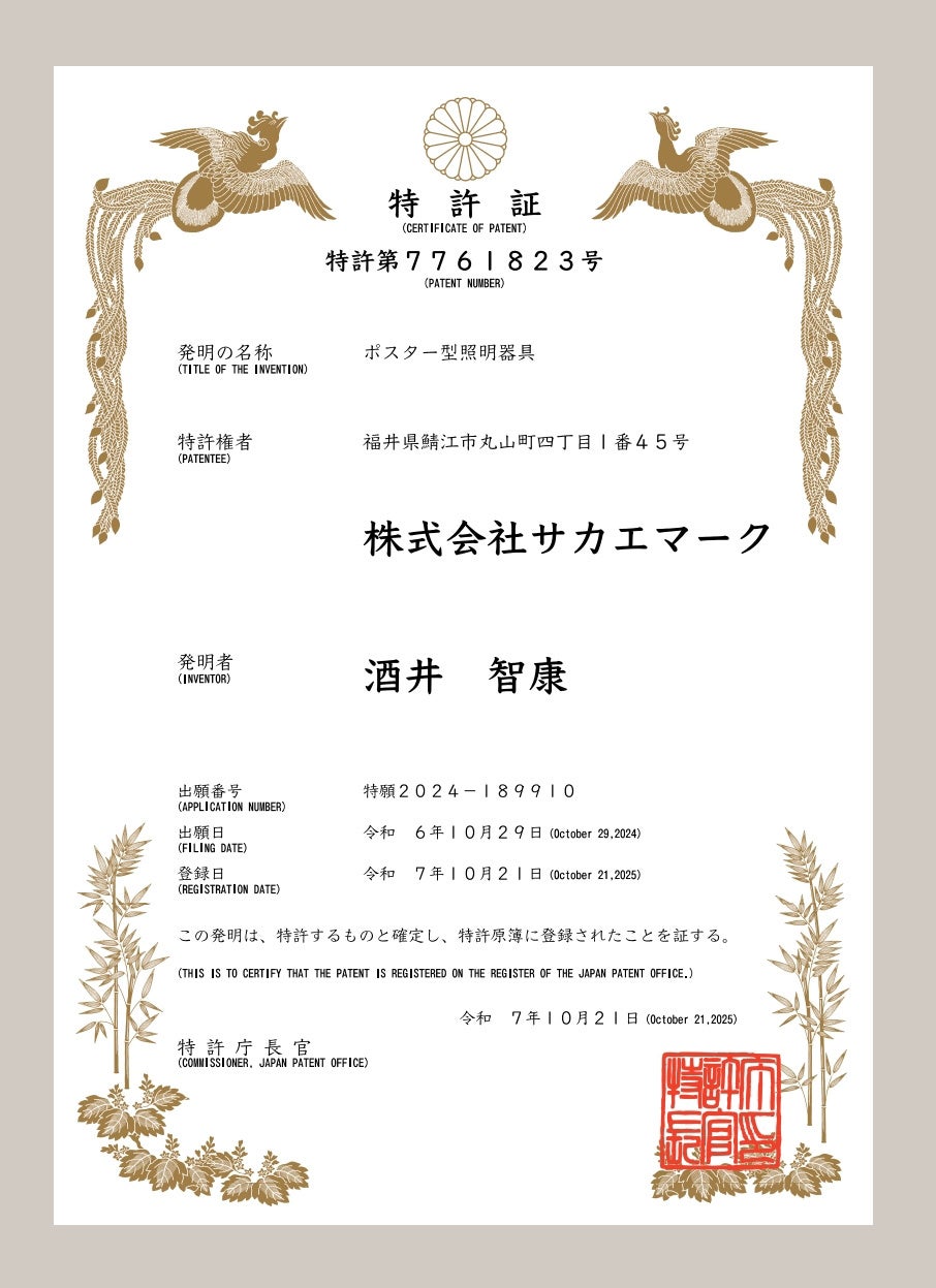 株式会社サカエマーク(本社:福井県鯖江市、代表取締役:酒井智康)が開発・展開する照明プロダクト「POSTER LIGHT®」について、これまで出願しておりました特許が、このたび特許庁より正式に登録されました。