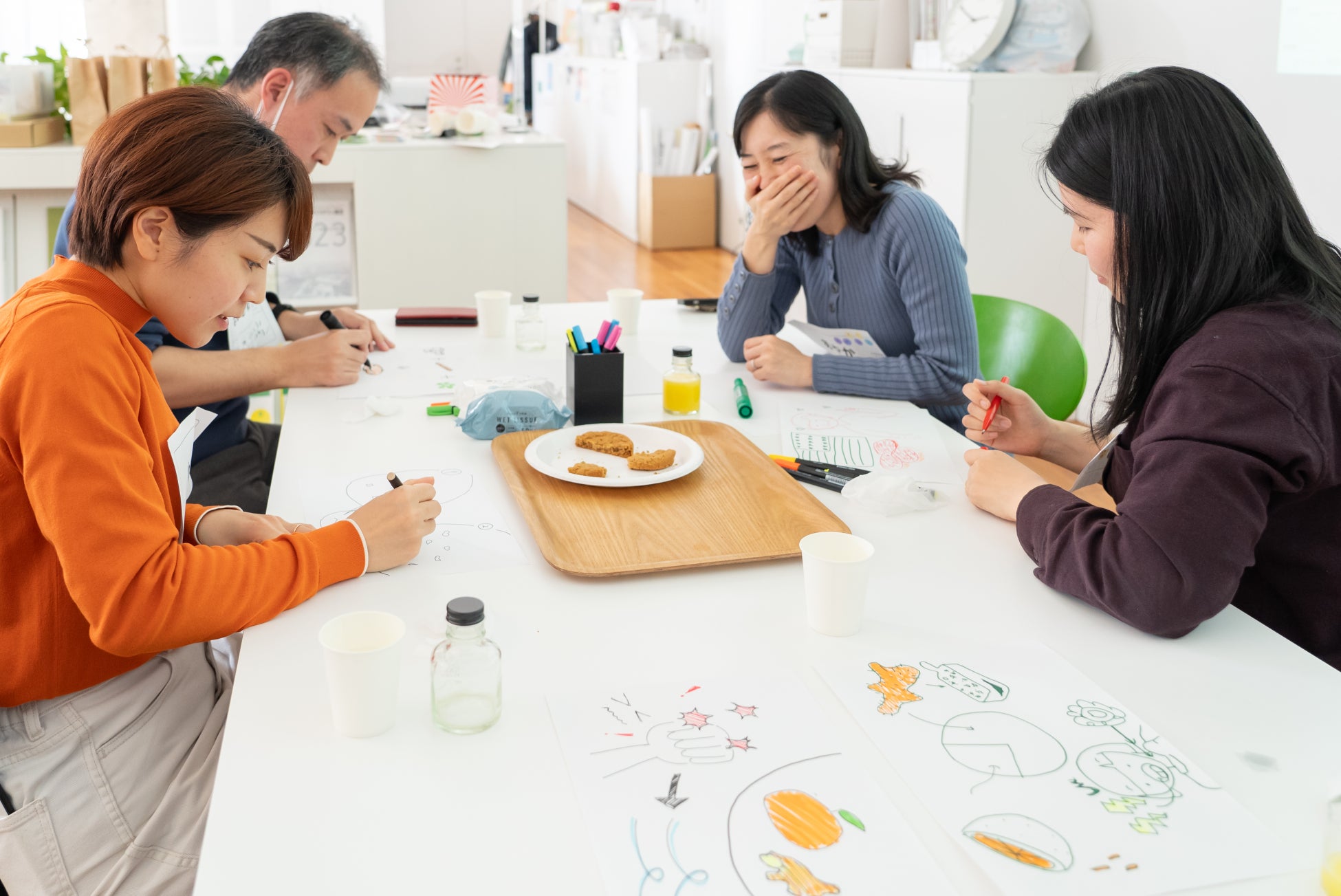 最後にアウトプットした食レポをみんなに共有タイム。原材料を予想してイラストに描く方や5点満点で評価する方、味の感想を絵文字で表す方など、十人十色の食レポに。そうそう!そんな味がする!という声や、他チームのフードを実際に味見することで感想を共有する機会になりました。