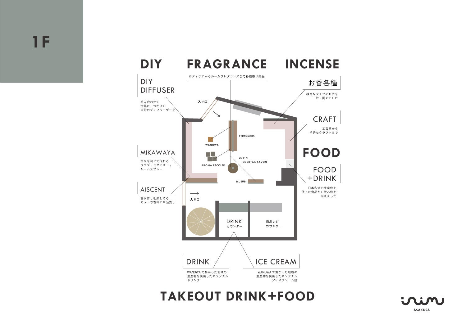 1Fは、香りの商品を中心にサーキュラーエコノミーの考えを元に廃棄される部分から香りを抽出して商品に落とし込み、売り上げの2%を原料の生産地域に還元するWANOWAや、香り(¥1,500)・ボトル(¥300~)・スティック(¥500)などを自分で選べ、自分好みのリードディフューザーを作ることができるDIY DIFFUSER(部材売り場)などもある。また、調香師が作る香りがコンセプトのPERFUMERSからはinimu店舗限定の香り【銀木犀】も8月26日(土)より発売する。