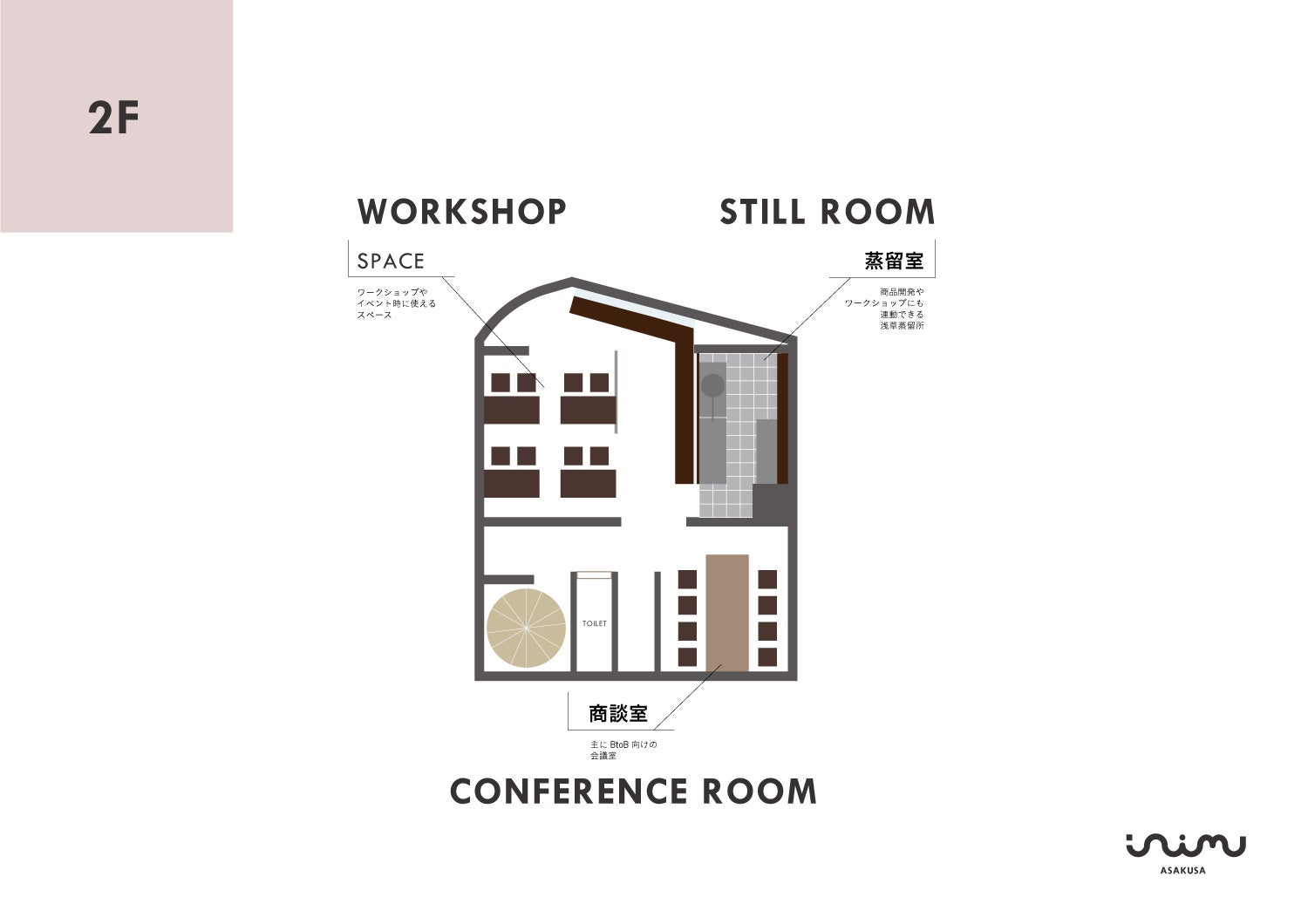 2Fは、ワークショップスペースがあり、26種から香りを選ぶ香水作りのワークショップなどを体験でき、日本各地の香りの産地や蒸留所ともオンラインでつなぎながらのオンライン型ワークショップも企画運営していく。また一から香りを作ることができる蒸留器も設置し、蒸留器で作った香りを使うワークショップなども随時開催予定。商品開発や地域の人が育てたハーブなどを蒸留することができるような場としても活用予定。