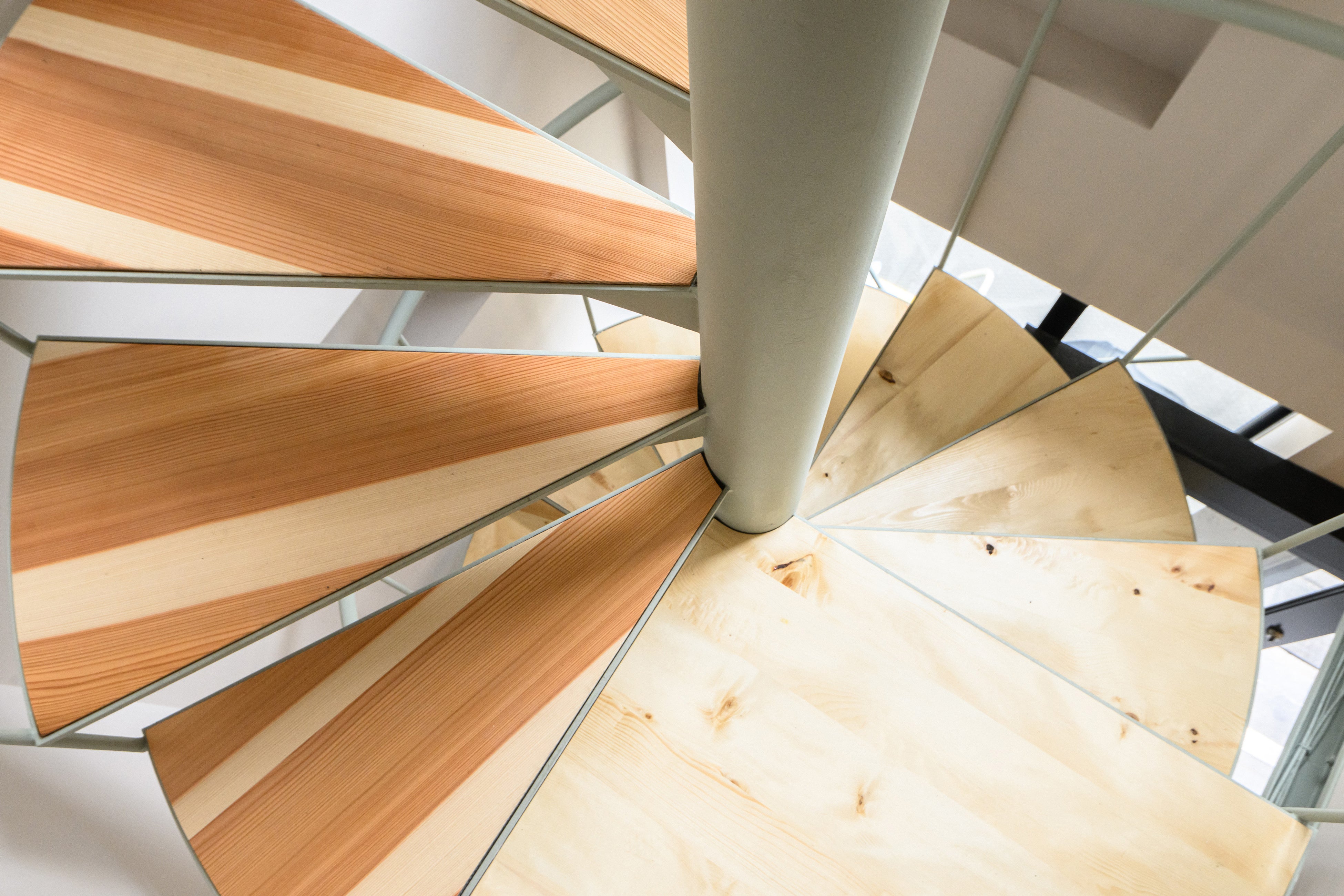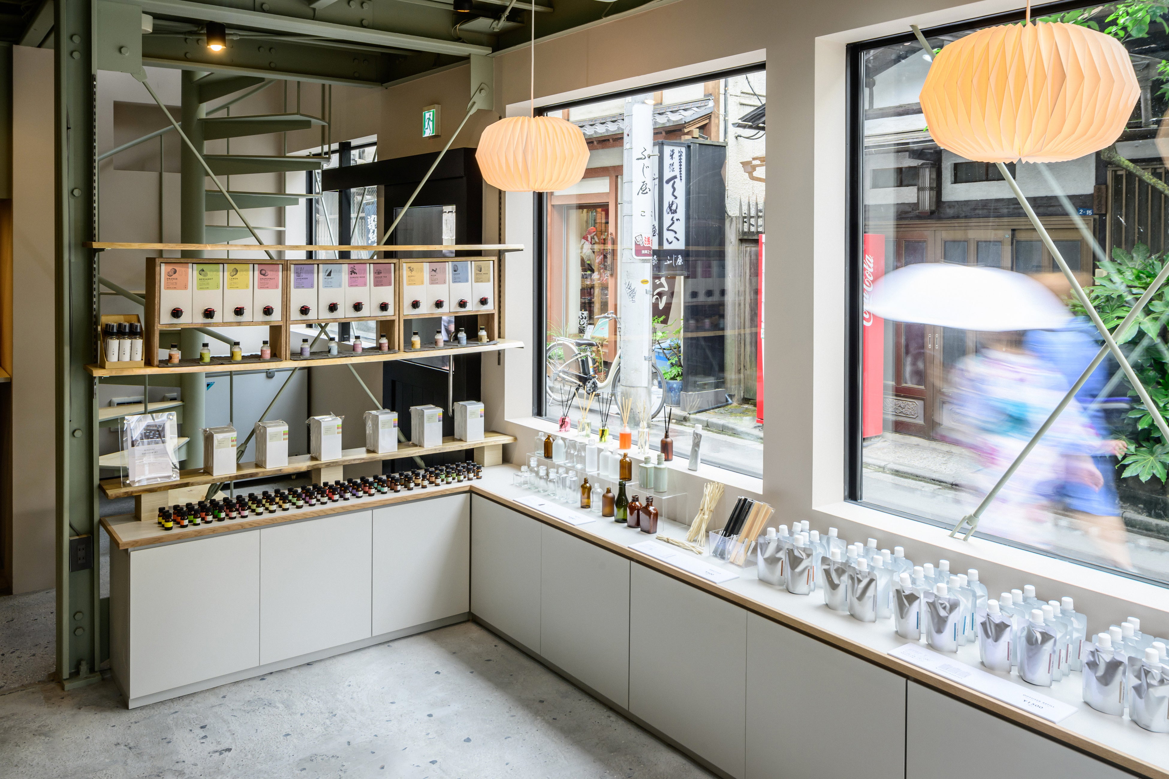 店内は、新潟県の安田瓦を再利用した床・レジカウンターに、岐阜県の木材を使用した棚、高野槇と杉の2種を組み合わせたオリジナルな螺旋階段、また燕三条で作る店頭看板など日本の工芸や素材を随所に使用。