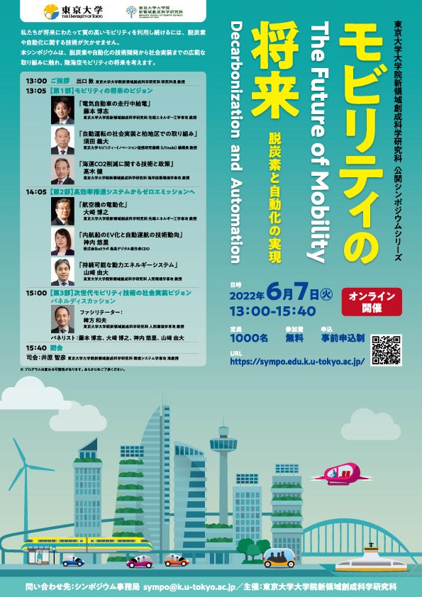 東京大学大学院新領域創成科学研究科は、2022年6月7日(火)13時より公開シンポジウム「モビリティの将来 ― 脱炭素と自動化の実現 ―」をオンラインにて開催します。