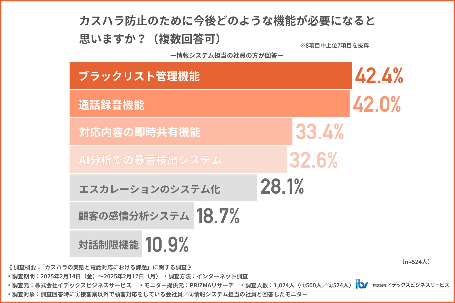 最後に、「カスハラ防止のために今後どのような機能が必要になると思いますか?(複数回答可)」と質問したところ、『ブラックリスト管理機能(42.4%)』と回答した方が最も多く、『通話録音機能(42.0%)』『対応内容の即時共有機能(33.4%)』『AI分析での暴言検出システム(32.6%)』と続きました。