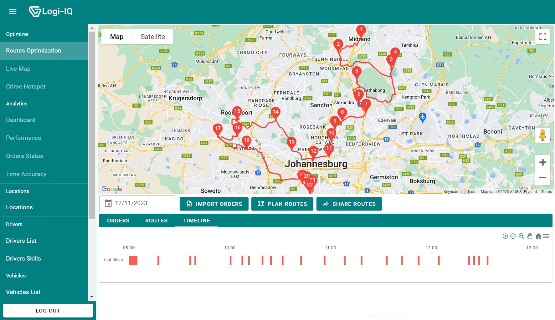 最初の機能はルート最適化 (Route Optimization)です。Logi-IQ は、配送タスクの優先順位、ドライバーの空き状況・スケジュール、各種車両の収容能力、安全性の考慮事項を考慮しながらその時々で最適なルートの自動設定をします。ドライバー側も、自身のスマートフォン上のアプリにて自分がその日に完了させるべき配送タスク(一覧・詳細)および進むべきルートが確認出来るため、安全運転や末端顧客のケアに集中することが出来ます。