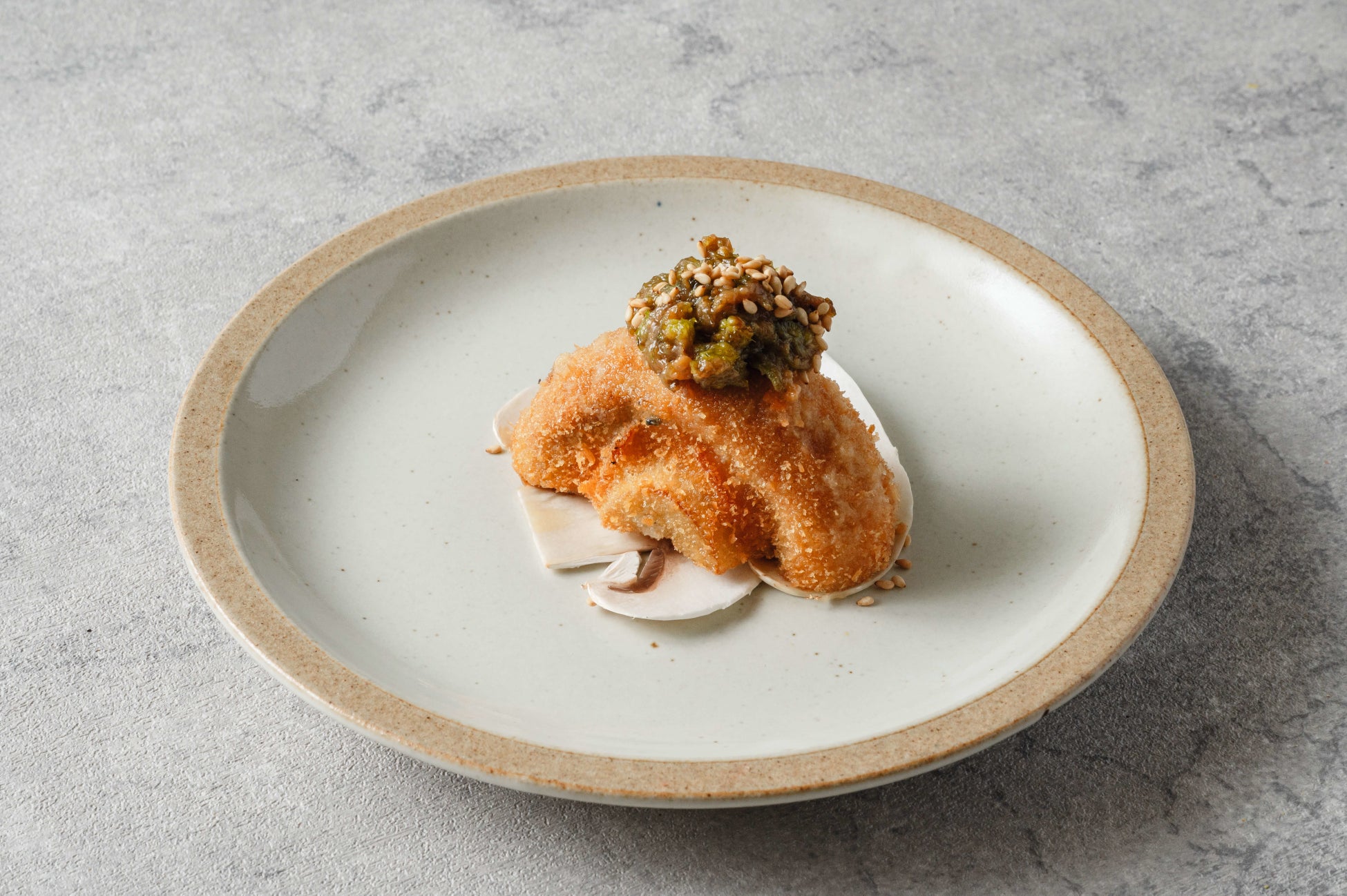 じっくりと火を入れることで、フキノトウの心地よい苦味と甘味を引き出しました。ジューシーなマッシュルームのカツのうま味を引き立てる、中毒性のある味わいです。
